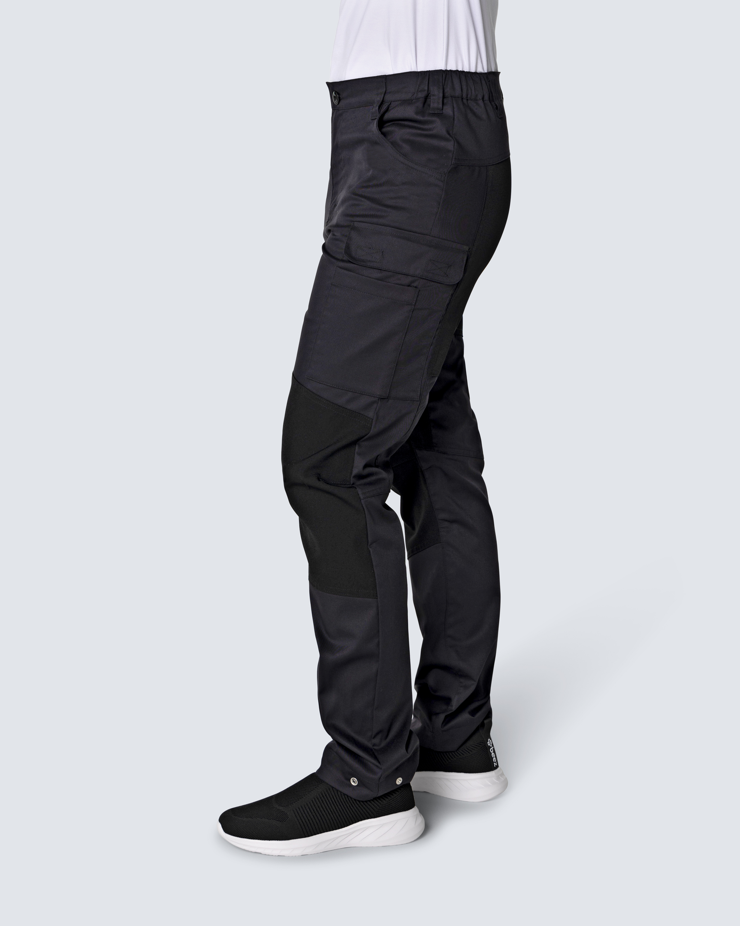Bekväm arbetsbyxa i dammodell tillverkad i stretchigt material. Extra flexibilitet genom infällda paneler i fyrvägsstretch i stuss, gren och på knän. Resår i linningens sidor, knäppning med knapp och gylf, och hällor för bälte. Reglerbar benvidd med tryckknapp och förböjda knän för större rörelsefrihet. Byxan har två sidfickor och stängningsbara benfickor med mindre fickor utanpå, för exempelvis pennor eller mobiltelefon.