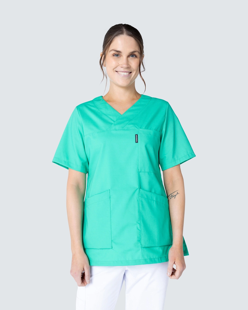 Feminin arbetsblus i lätt insvängd modell och dekorativ v-ringning. Blusen har en bröstficka samt två rymliga höftfickor, med en extra mobilficka och nyckelhälla på insidan. Sprund i sidorna ger god rörelsevidd.