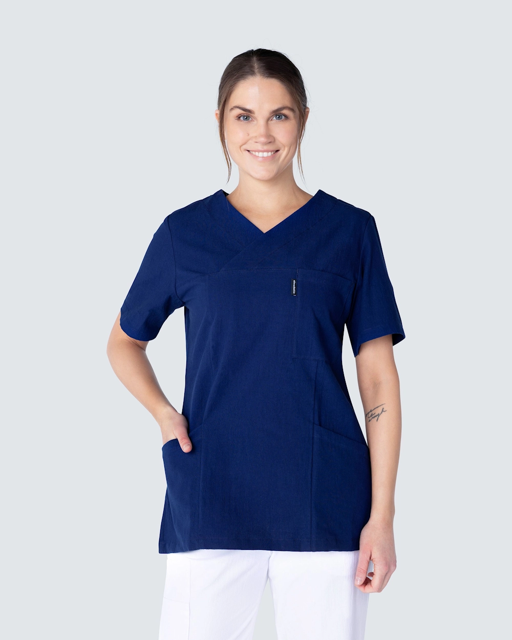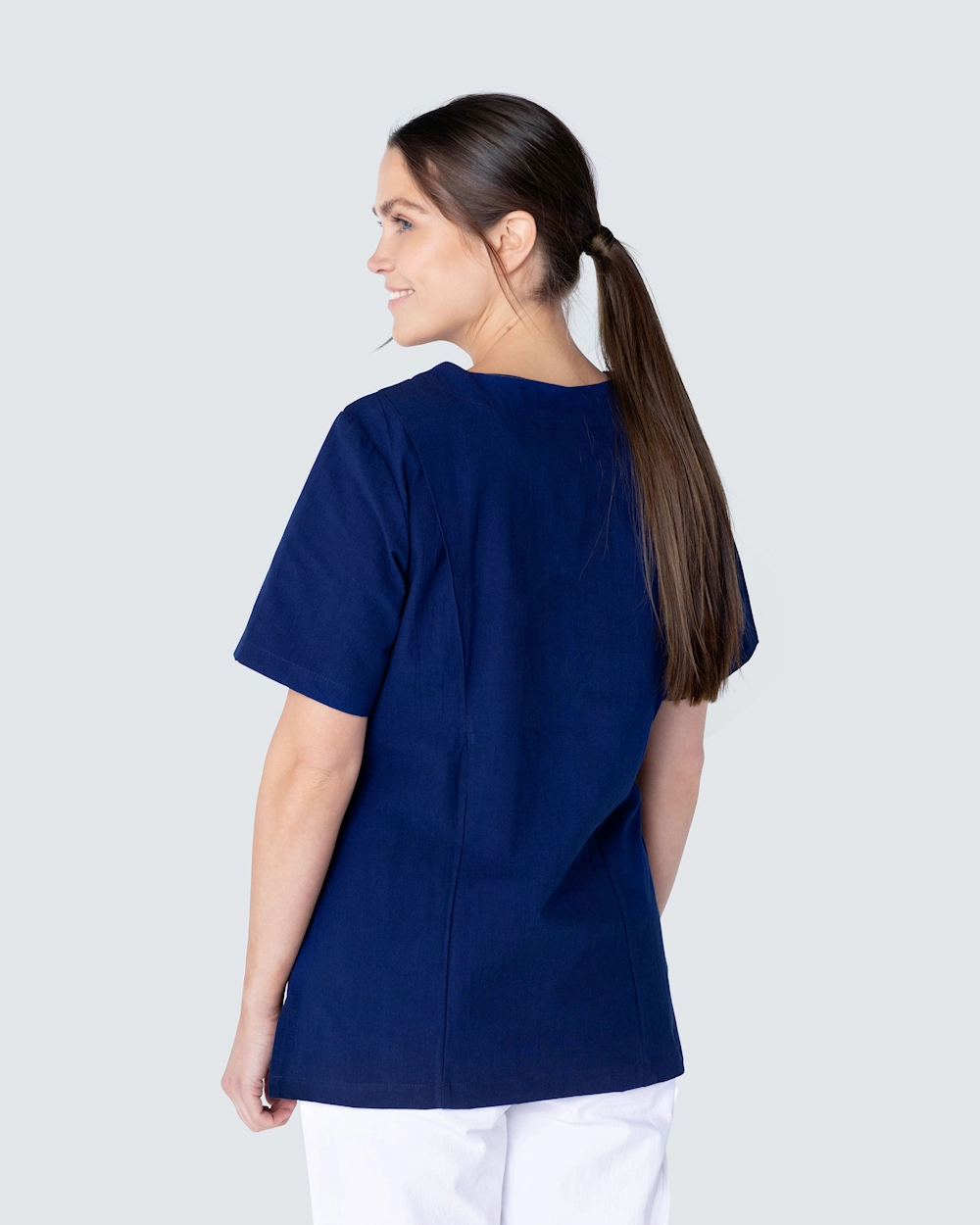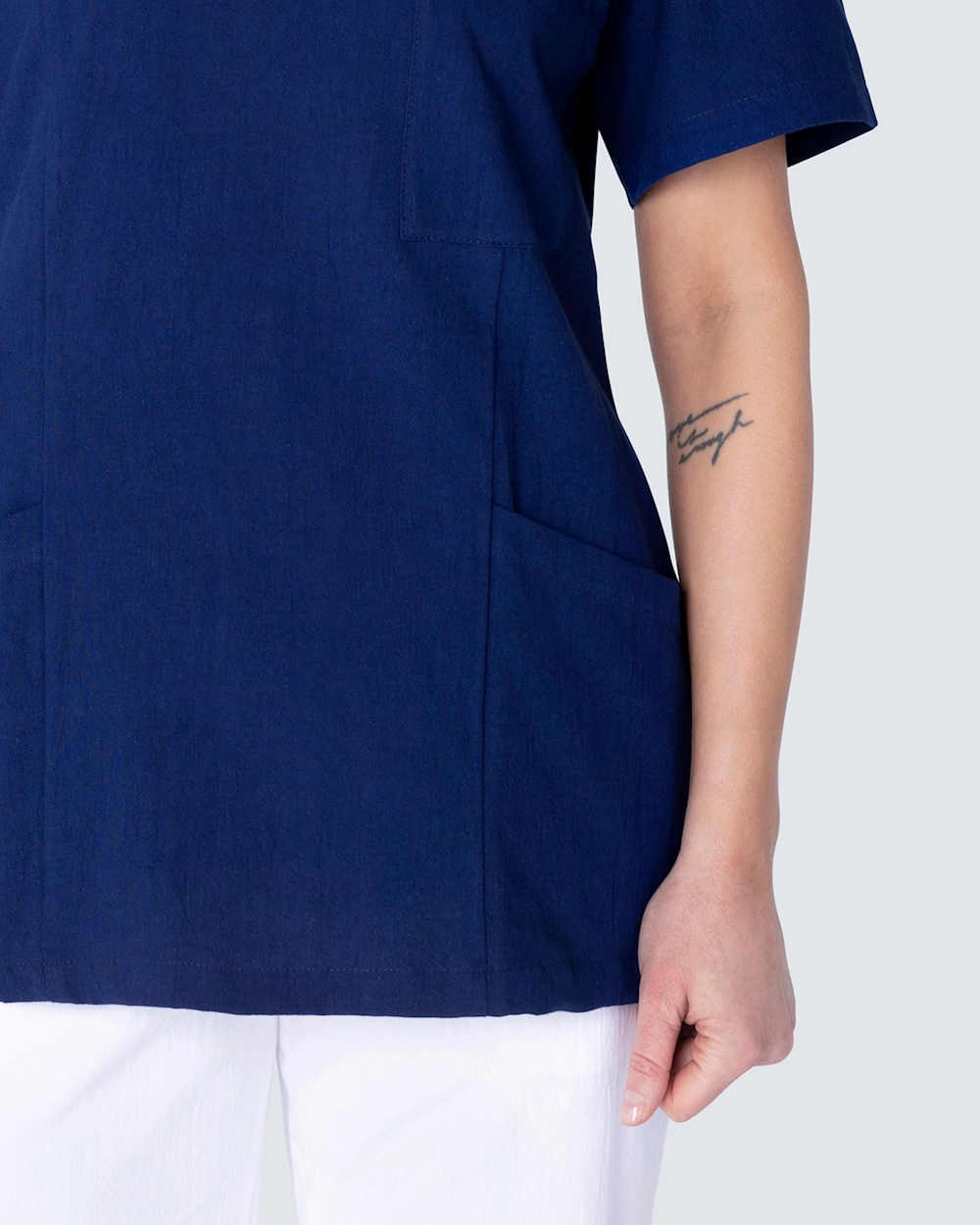 Bussarong i krinklad bomull som ger en lätt och sval känsla. Den krinklade bomullen är lättskött och kräver minimalt med skötsel, såsom strykning. Bussarongen har v-hals och är i lätt insvängd modell, vilket ger en fin silhuett och passform. Med både bröstficka och två höftfickor med mobilficka och nyckelhälla har du gott om plats för diverse arbetsredskap och artiklar du behöver under en arbetsdag.