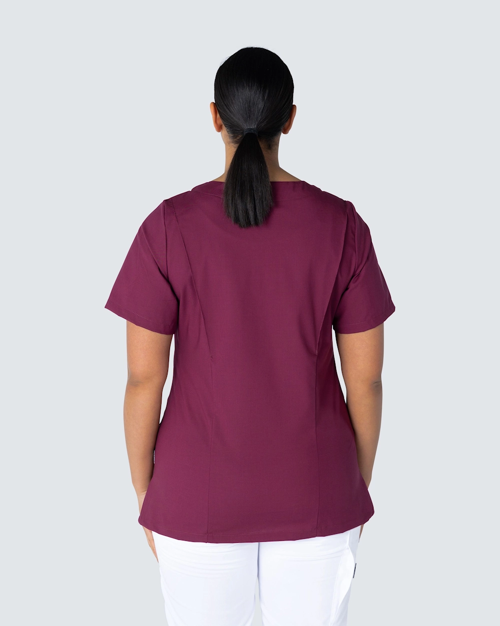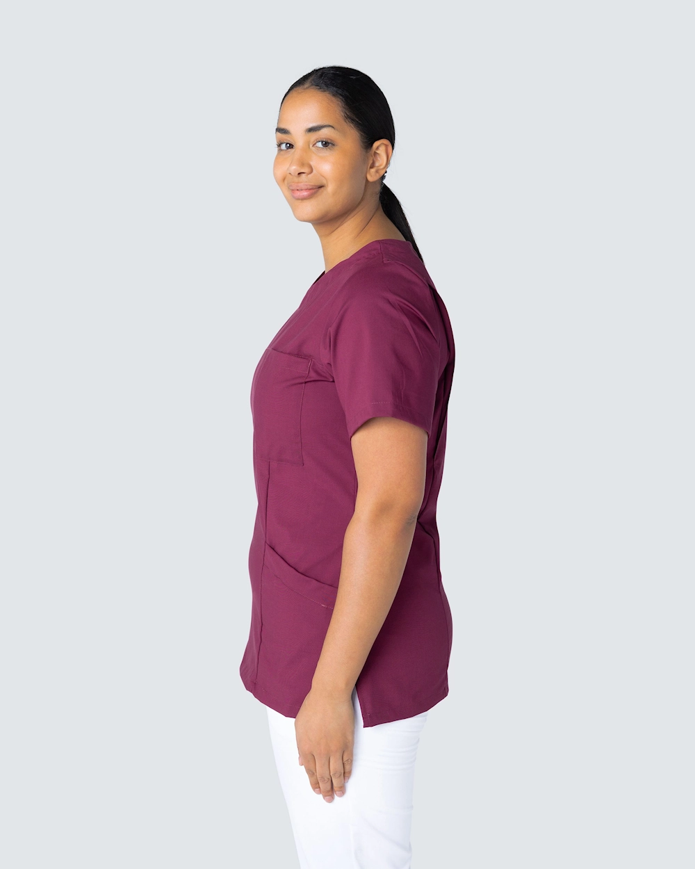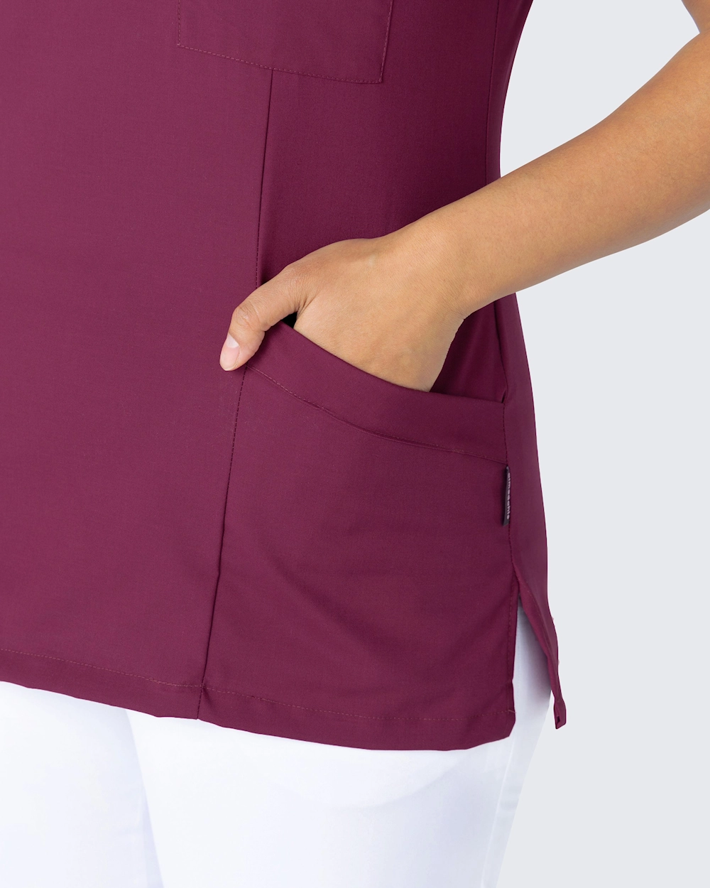 Vacker arbetsblus med lätt insvängd midja och rundad hals ger en fin och stilfull passform. Blusen har både bröstficka och två rymliga höftfickor. Med sprund i sidorna får du en god rörelsevidd.