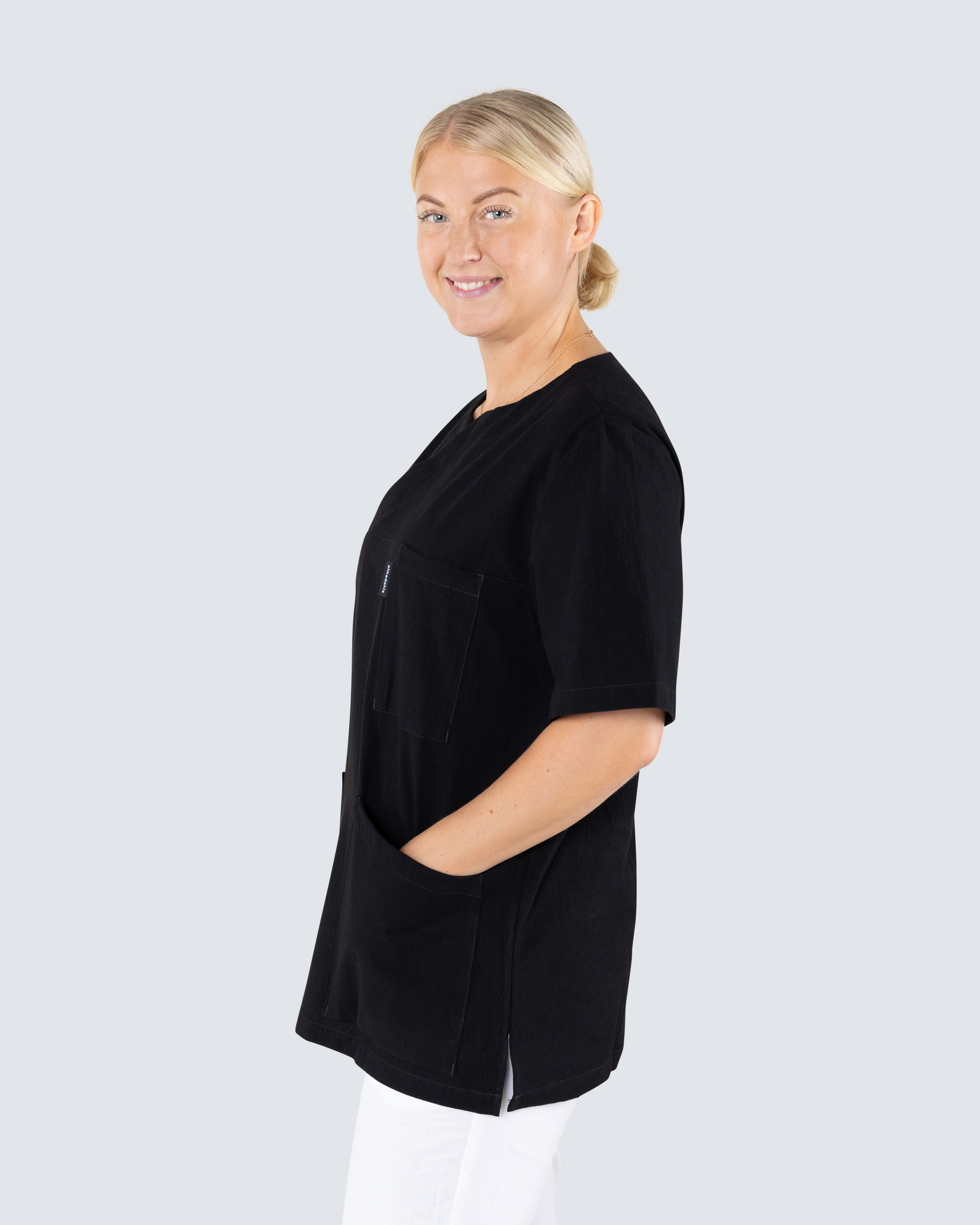 Bussarong i rak unisexmodell med praktiska och rymliga fickor som har gott om plats för arbetsredskap. Höftfickorna har mobilficka och nyckelhälla där du enkelt kan fästa nycklar eller ID-kort. Bussarongen har rund v-hals vilket ger en fin detalj. Med sprund i sidorna får du gott om rörelsevidd. Bussarongen är tillverkad i krinklad bomull vilket ger en sval och behaglig känsla. Det krinklade tyget minskar även behovet av skötsel, såsom strykning.