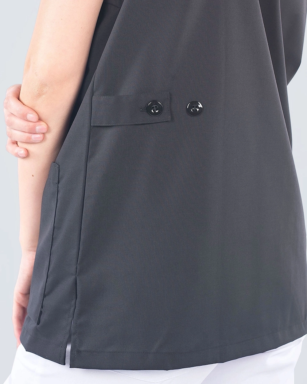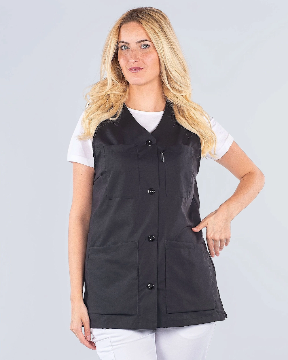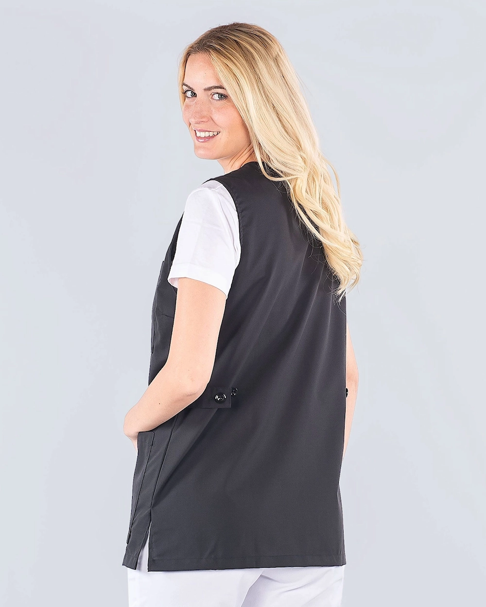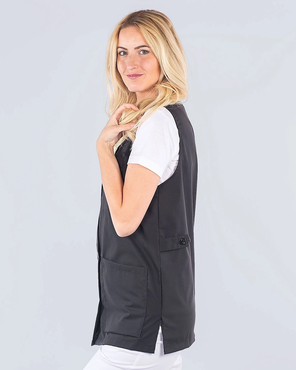 Denna arbetsväst har en v-ringad hals och är lätt figursydd för en fin passform. Med en knappslejf baktill kan du reglera midjan och själv anpassa passformen. Västen har gott om plats för diverse arbetsredskap med två bröstfickor och två höftfickor.