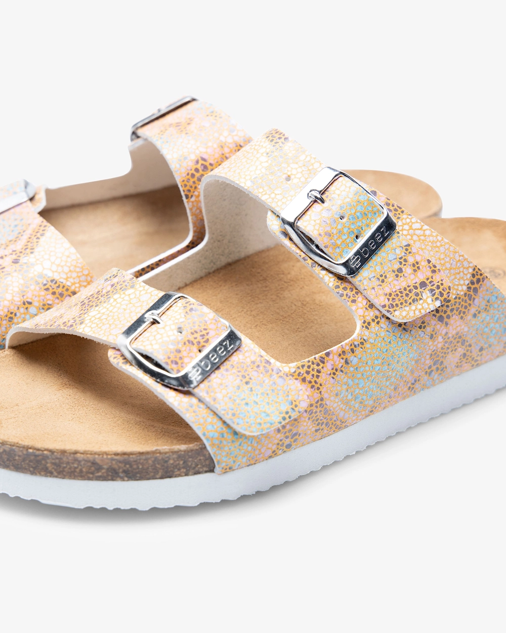 Beez Joie är en arbetssandal med hög komfort. Sandalen har en klassisk design och finns att välja i flera trendiga färger och mönster. Joie har en anatomisk fotbädd av naturkork och naturgummi. Tågrepp och tydlig utformning för hålfoten ger en jämn belastning för foten och motverkar trötta och ömma fötter. Med en stabil slitsula EVA-gummi får sandalen ett bra grepp och EVA-gummins stöttåliga egenskaper ger skon dämpningsegenskaper som främjar fotens naturliga rörelse.