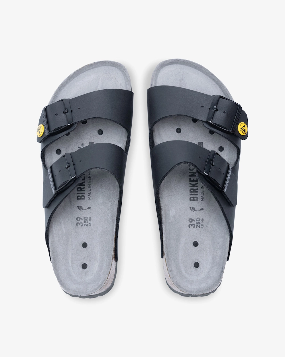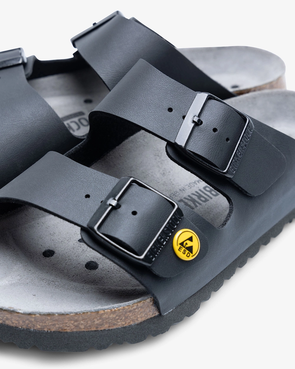 Birkenstock Arizona ESD förhindrar elektriska urladdningar och kan med fördel användas inom eltekniska yrken. Med dess särskilt utvecklade ESD-fotbädd och sula avges löpande mikrourladdningar, vilket innebär ett skydd för både individen och elektriska komponenter.