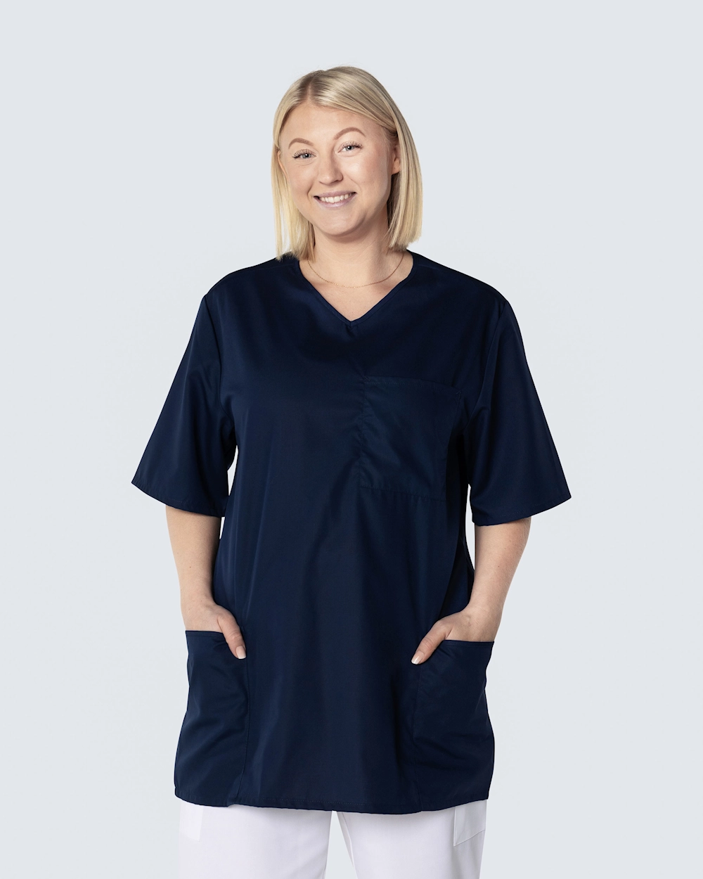 Bussarong med innovativ design som tack vare en ergonomiskt designad halsringning minskar belastningen på nacken. Detta bidrar till att förebygga och minska nack- och ryggsmärtor. Denna bussarong i unisexmodell har en bröstficka och två ergonomiskt placerade sidfickor. Tillverkad i material som känns behagligt och lätt mot huden, med slits i sidan för ökad rörelsefrihet.