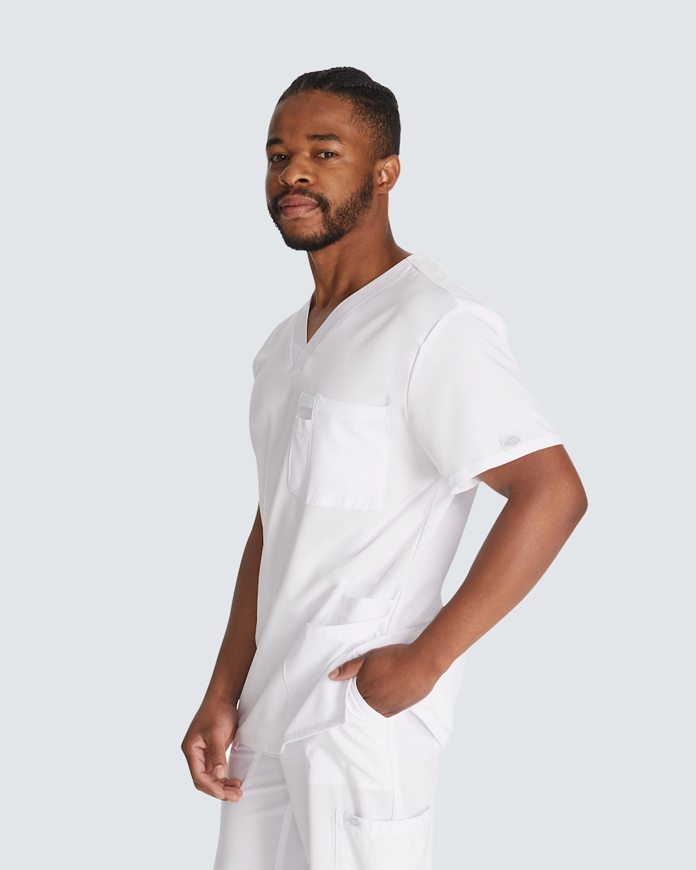 Herrbussarong från Dickies i klassisk v-ringad design erbjuder oslagbar funktionalitet och komfort för vårdpersonal. Med 4 fickor och en pennficka har du alla verktyg och hjälpmedel nära tillhands.