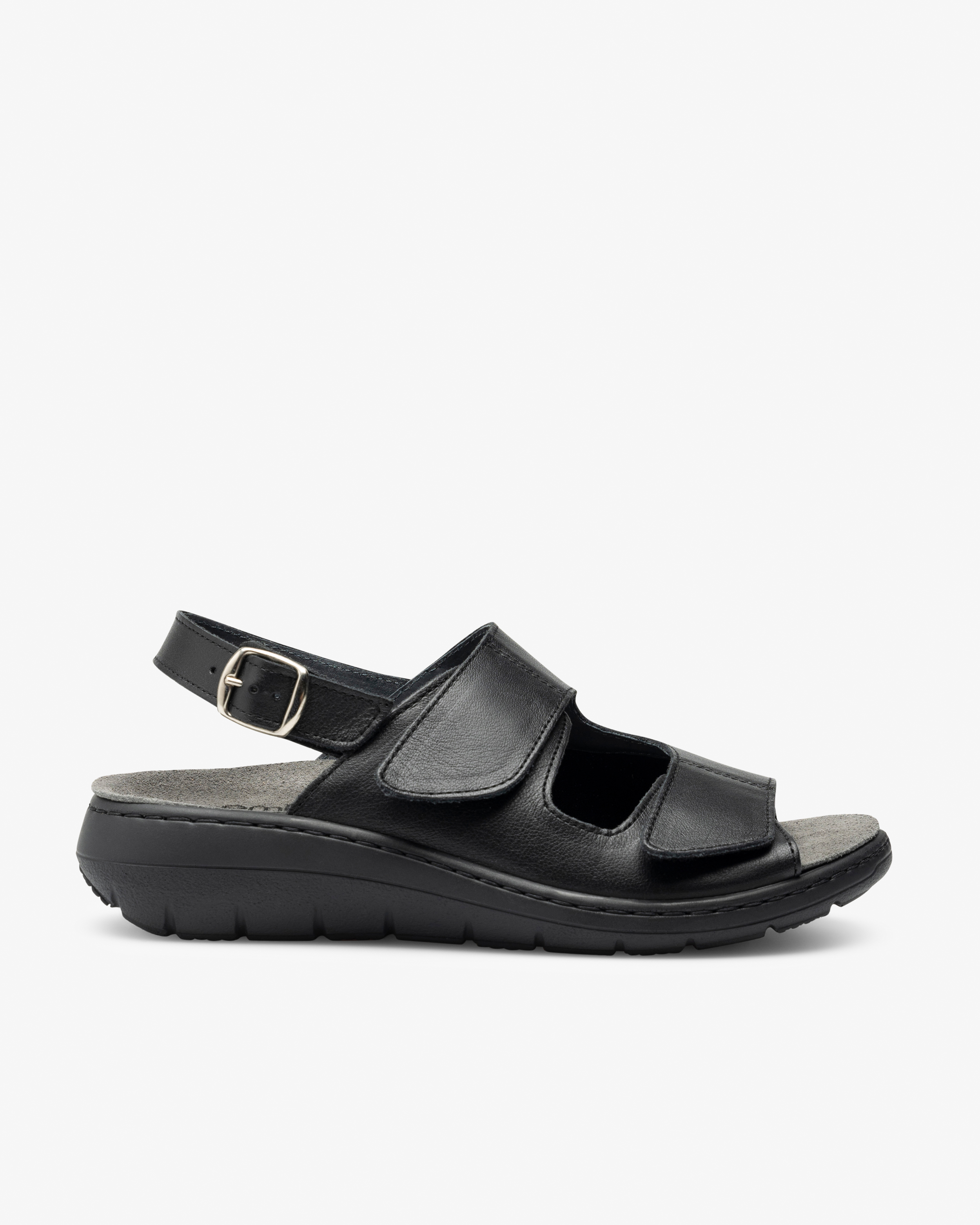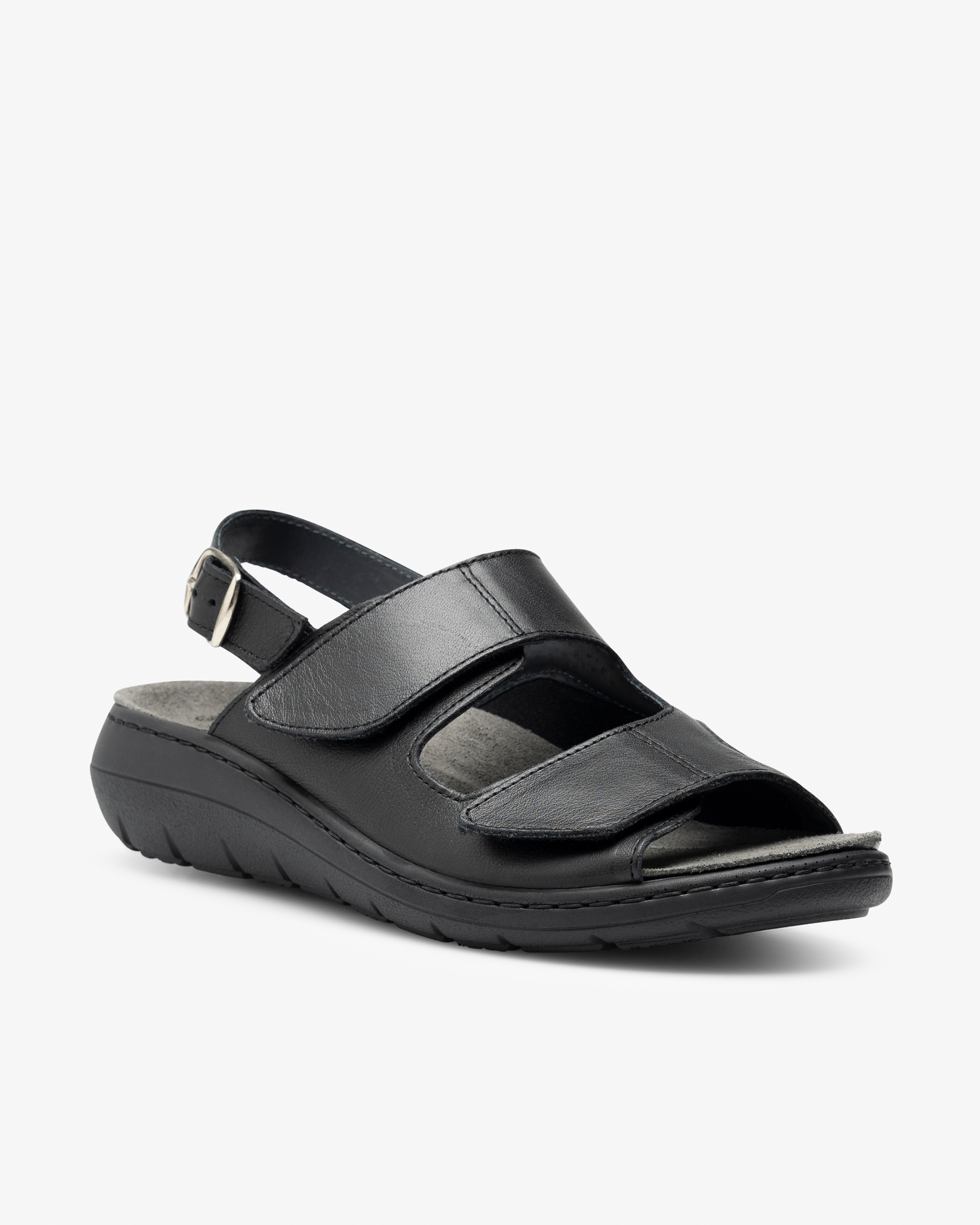 Fotriktig sandal i dammodell med utbytbar, ergonomisk fotbädd som ger stöd för hålfot och lyfter framfotsvalvet. Sandalens insida har ett elastiskt parti som ger extra flexibilitet och komfort vid exempelvis Hallux Valgus. Stabiliserande, justerbar hälrem med spänne och två justerbara remmar med kardborre upptill.