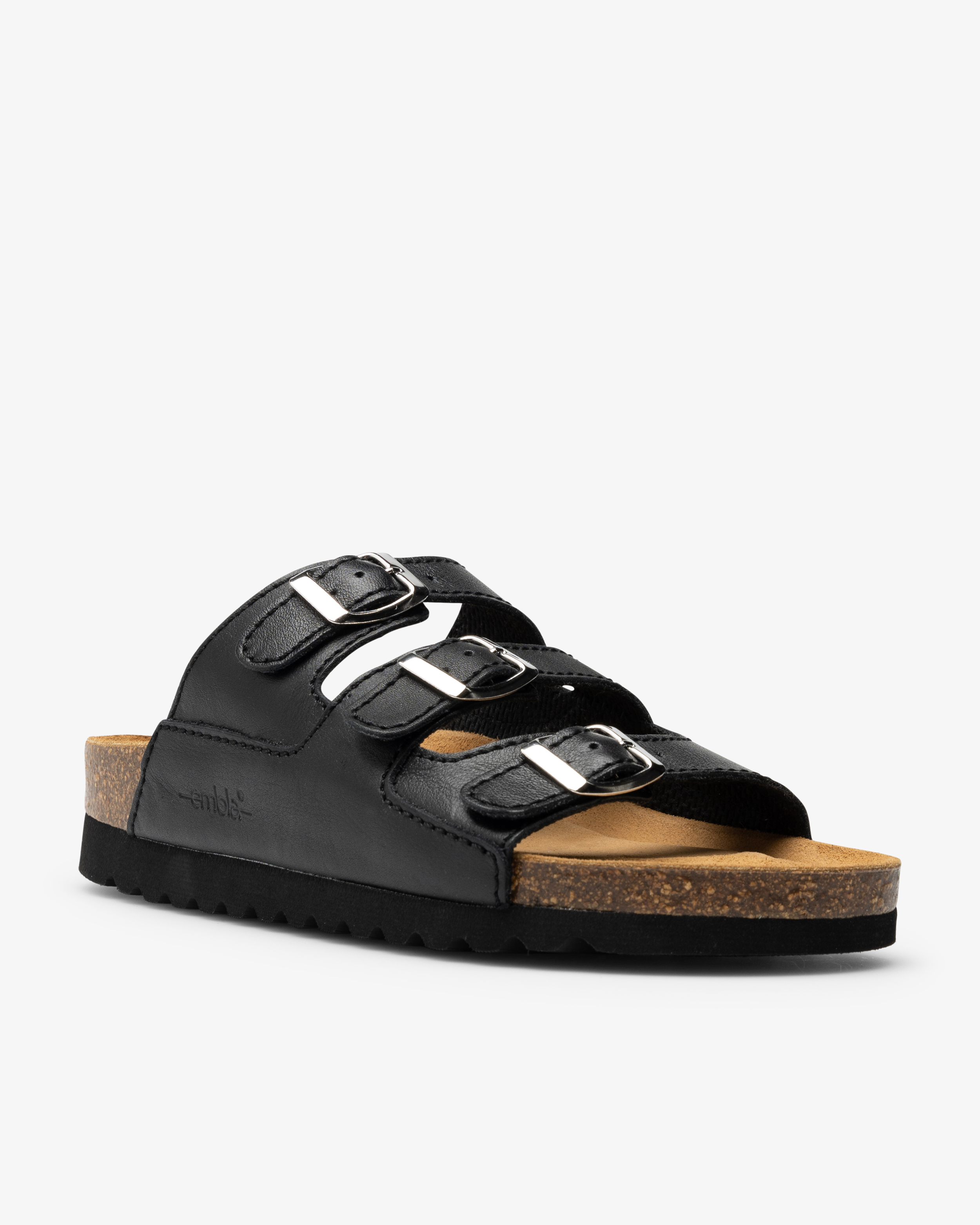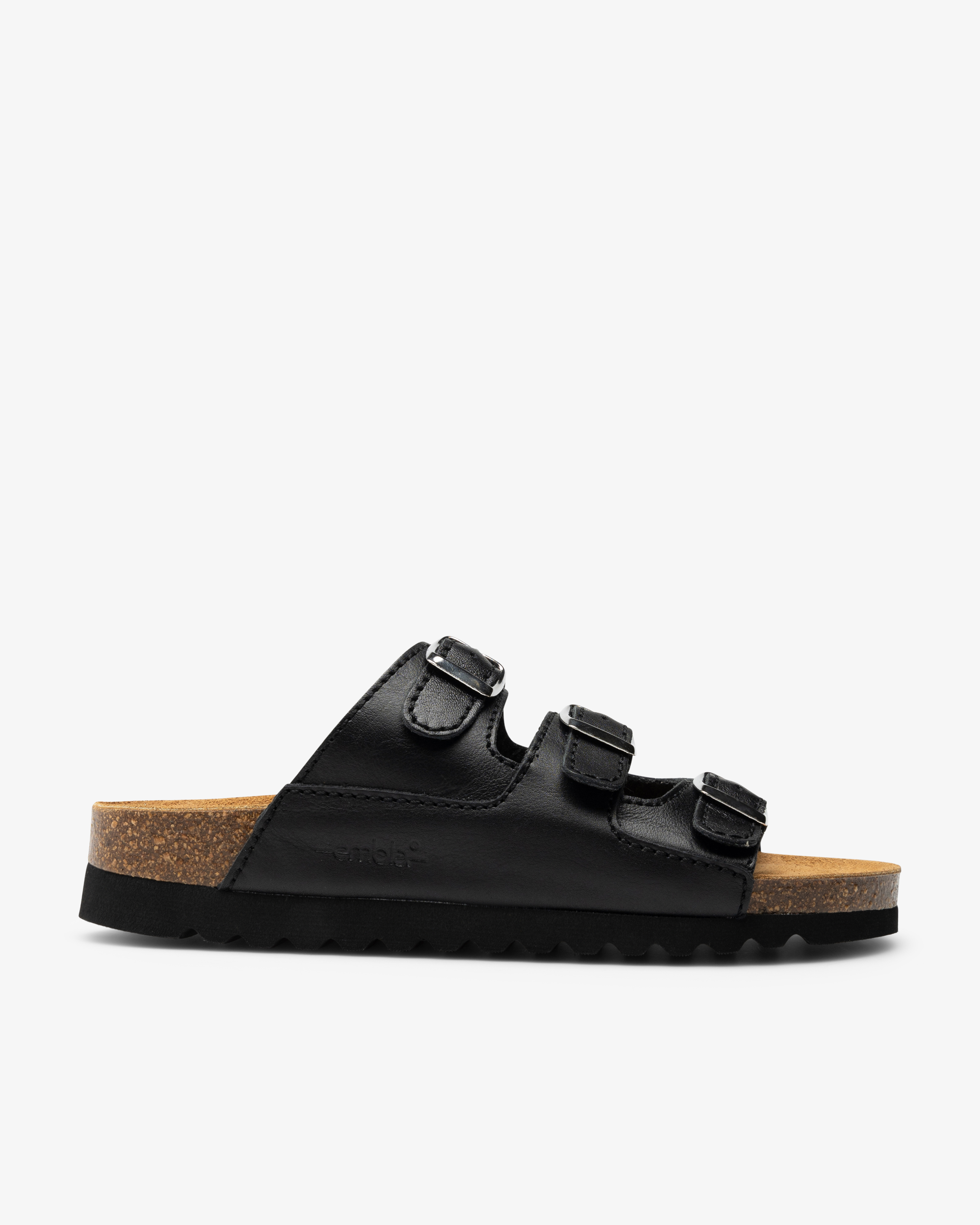 Damsandal i skinn med tre justerbara remmar med spänne. Anatomisk utformad fotbädd i kork som ger stöd för hålfoten. Fotbädden är skinnklädd och har ett mjukt sviktlager för optimal komfort. Sandalen har foder i cambrelletyg och en yttersula som greppar bra mot underlaget. Lämpar sig väl för både inomhus- och utomhusbruk.