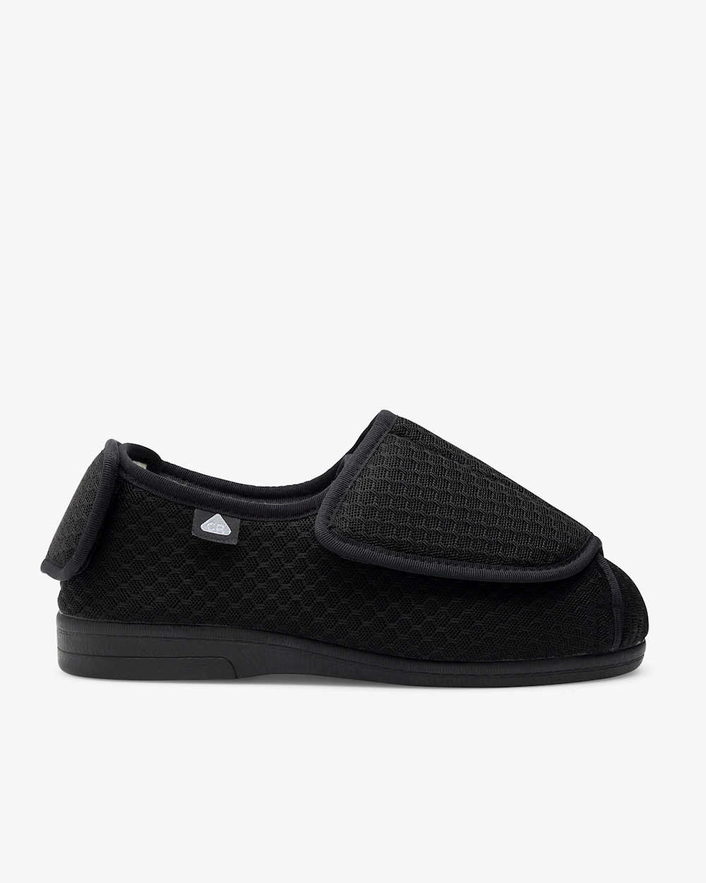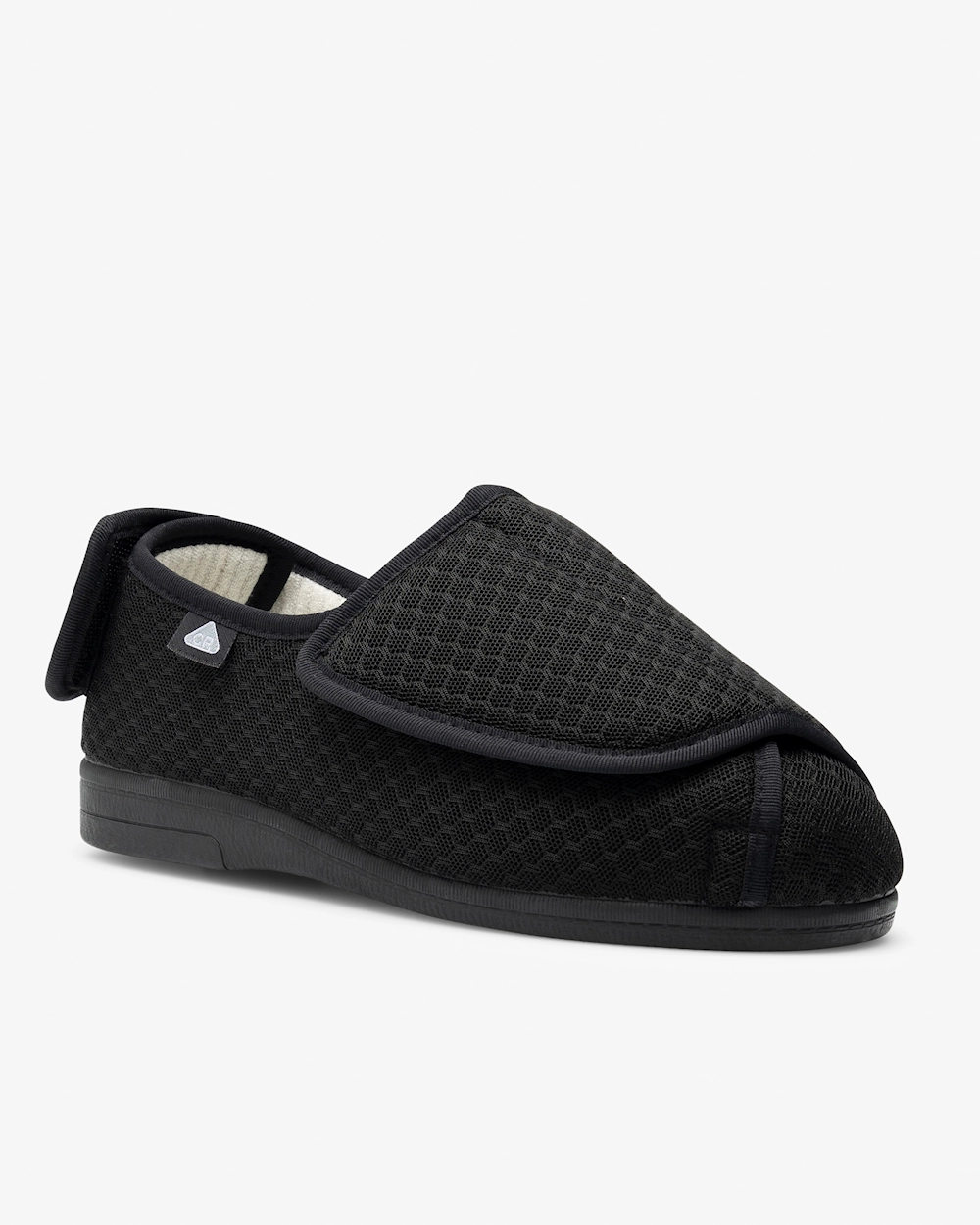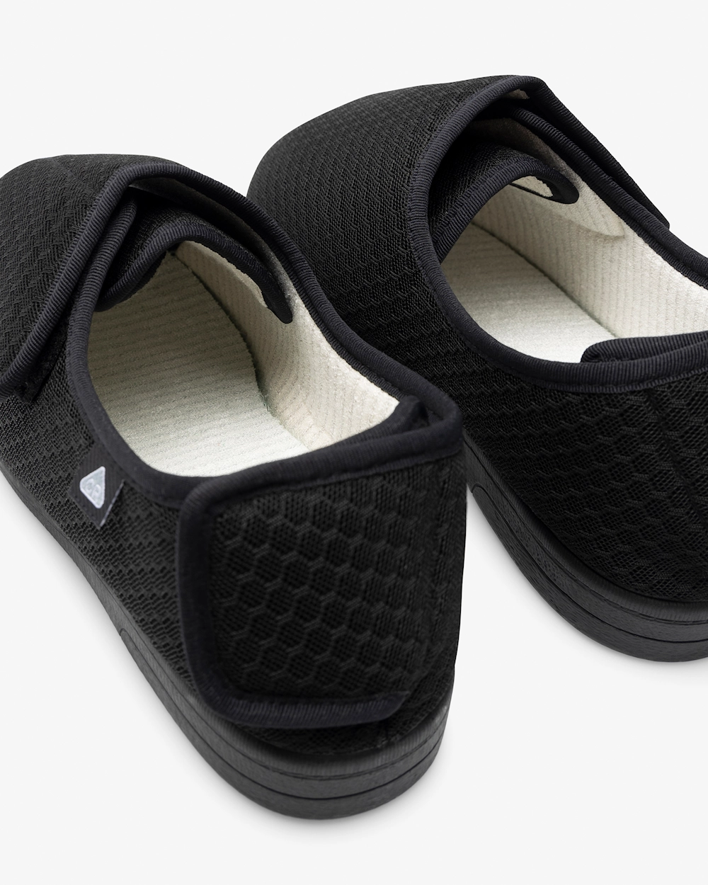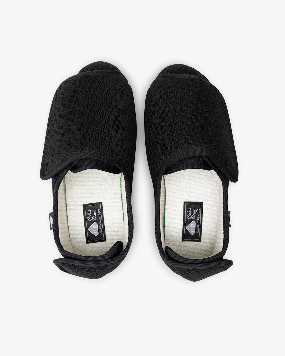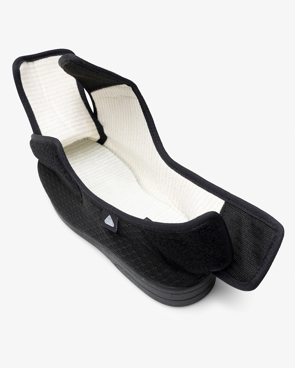 Helt öppningsbar specialsko i vattenavvisande material. Extra bred läst och kardborreknäppning för optimal passform och komfort. Skon har en stabil och halkfri sula och varm och mjuk ovandel som passar dig med känsliga fötter. Tvättbara och CE-märkta.