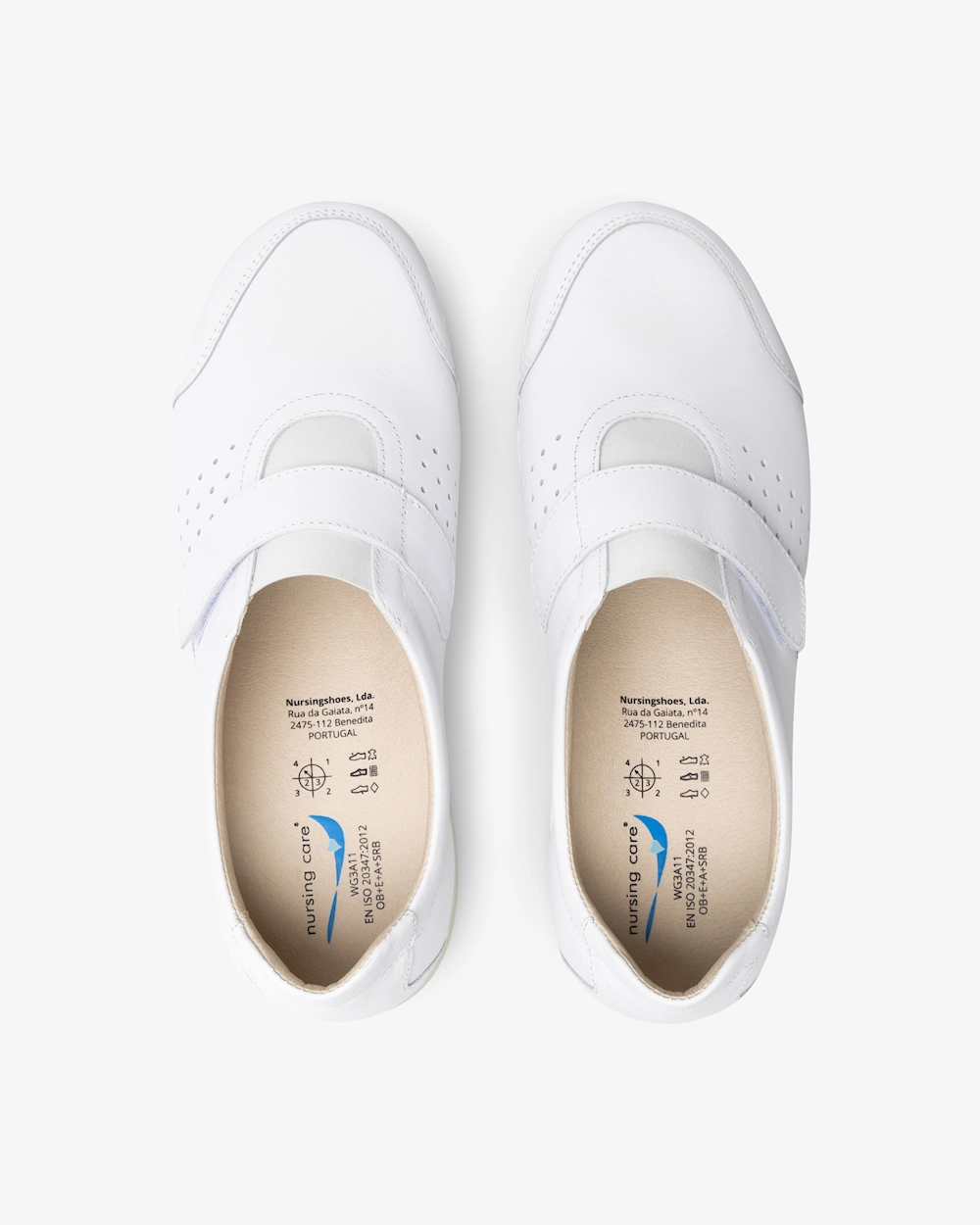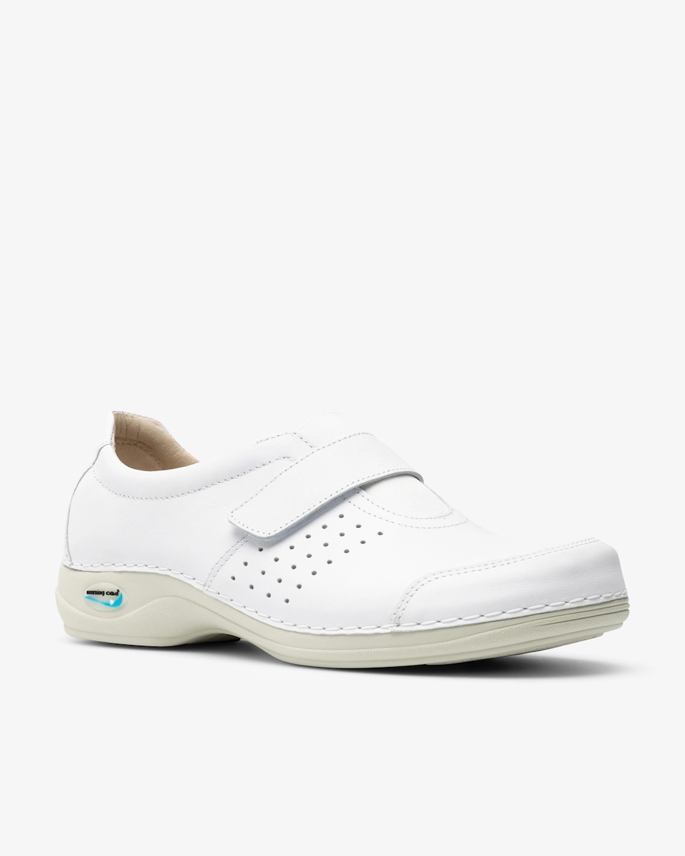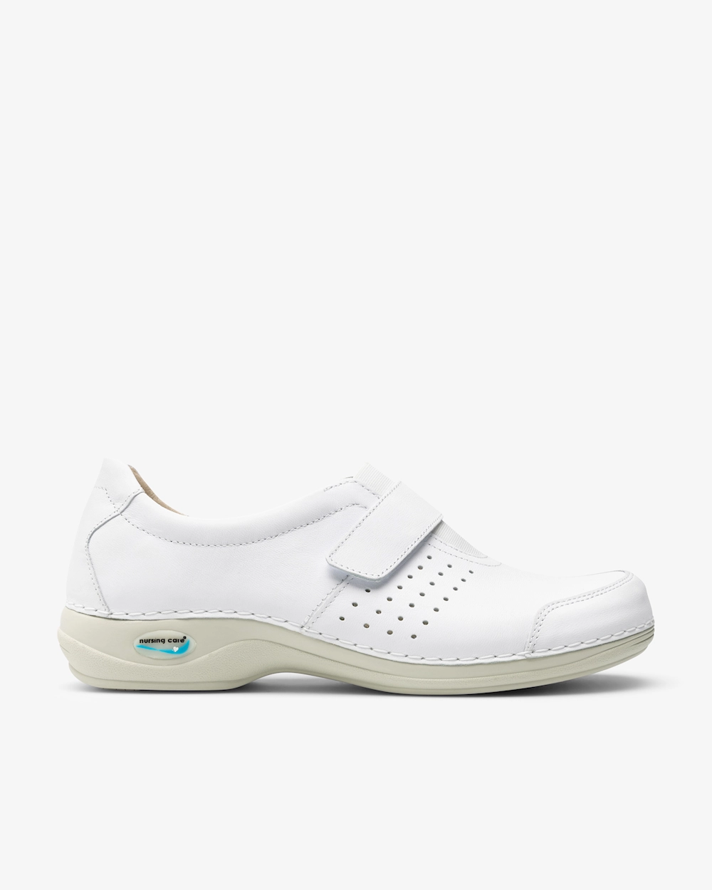 Fotriktig skinnsko väl lämpad för långa arbetsdagar inom hälso- och sjukvården. Skon kan tvättas i upp till 30⁰C och har en ergonomiskt utformad, utbytbar fotbädd. Resår och justerbar rem med kardborre upptill. Halkfri yttersula som greppar bra mot underlaget och antistatiska egenskaper som skyddar dig mot statisk elektricitet. Fodrar med microfiber.
