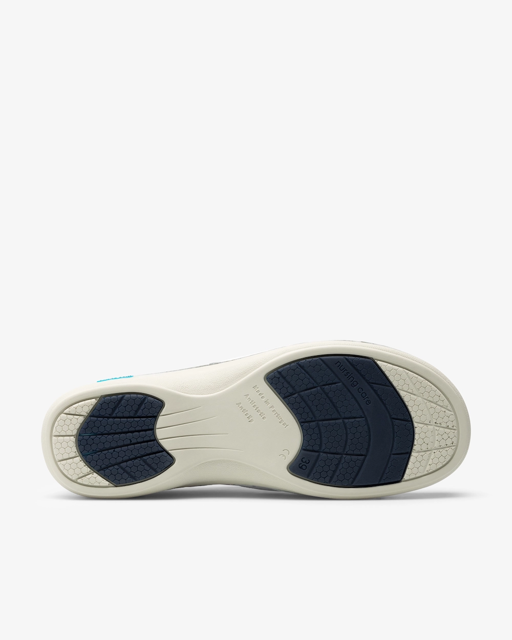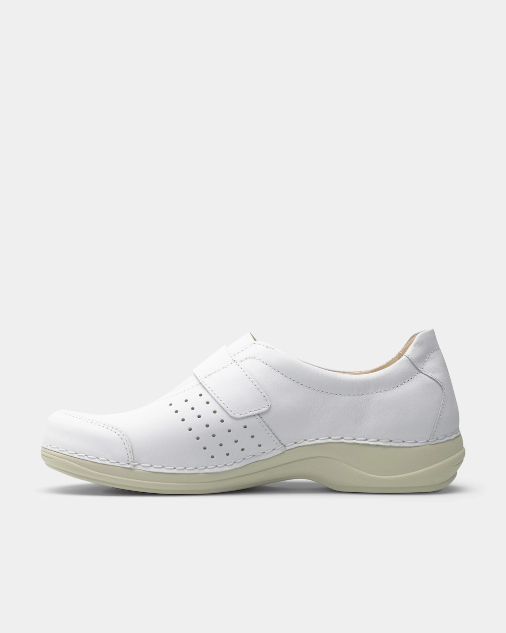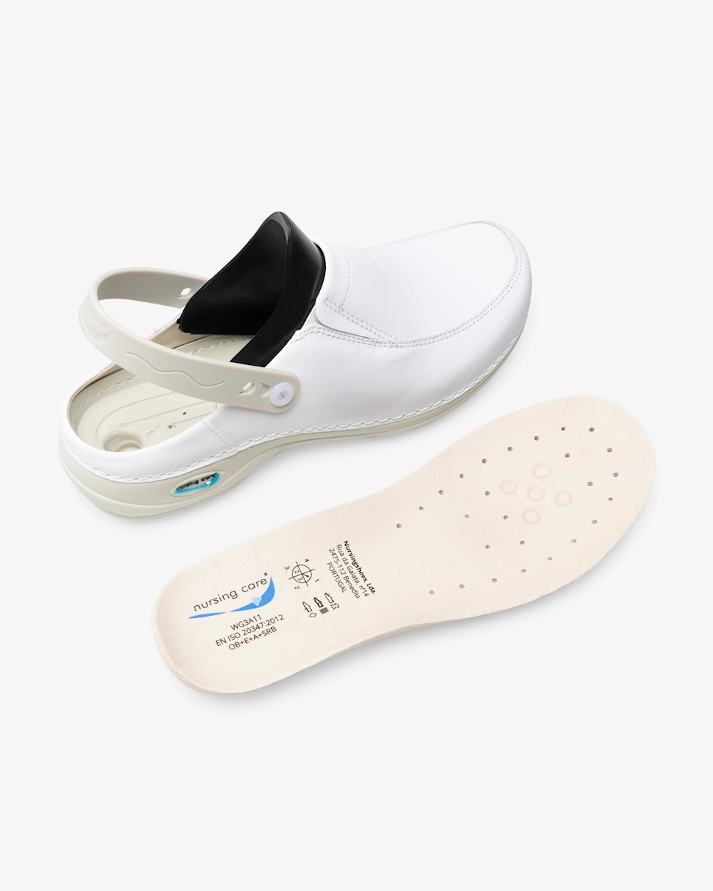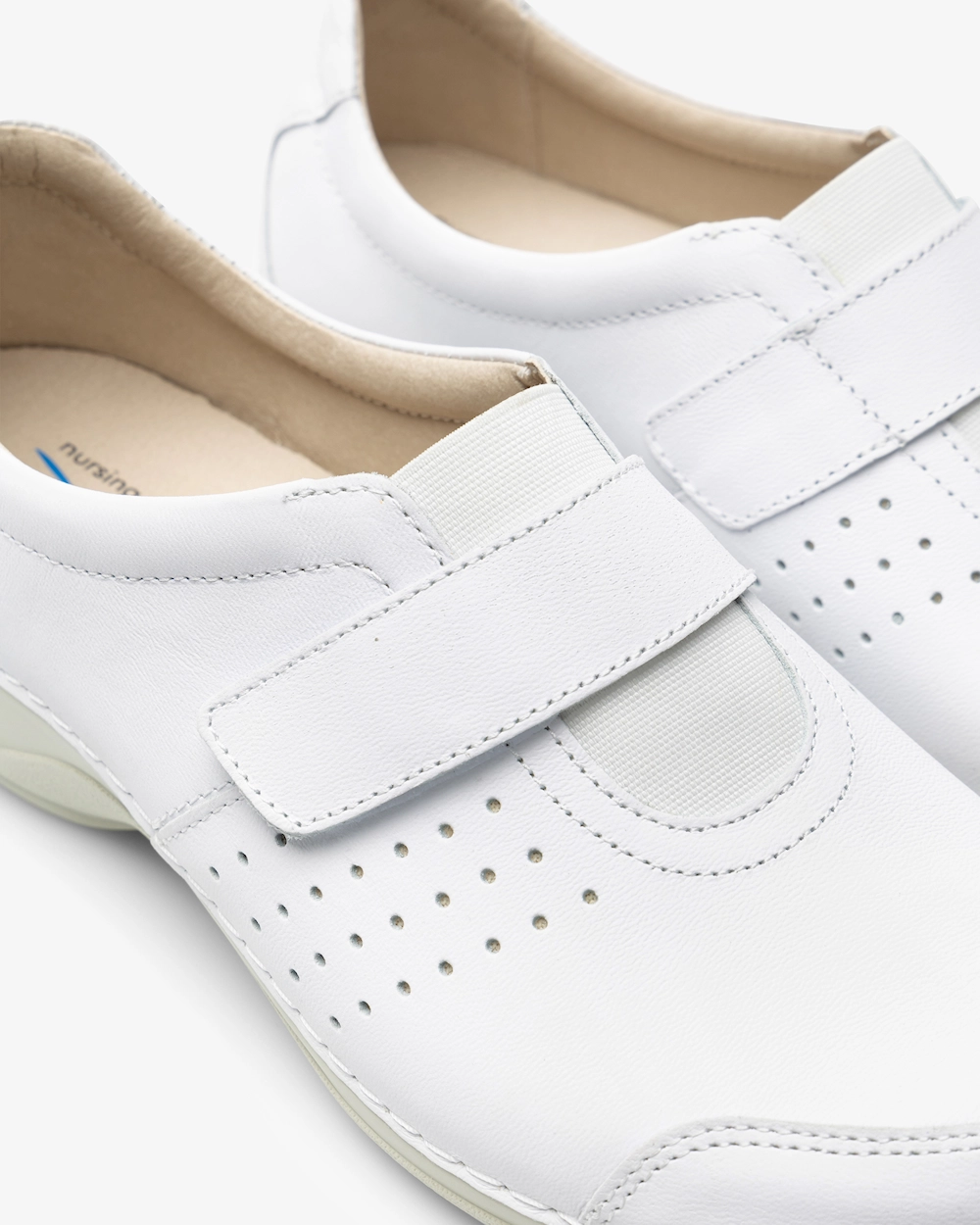 Fotriktig skinnsko väl lämpad för långa arbetsdagar inom hälso- och sjukvården. Skon kan tvättas i upp till 30⁰C och har en ergonomiskt utformad, utbytbar fotbädd. Resår och justerbar rem med kardborre upptill. Halkfri yttersula som greppar bra mot underlaget och antistatiska egenskaper som skyddar dig mot statisk elektricitet. Fodrar med microfiber.