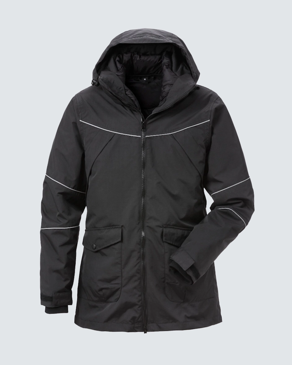 Ytterjackan har dragkedja fram samt fyra framfickor. Reflexer fram, bak och på ärmar. Avtagbar huva. Foder i ytterjackan. Tejpade sömmar över axel och ärm. 3000 mm vattenpelare. Den löstagbara innerjacka är vadderad och fodrad. Två framfickor och en innerficka. Stickade muddar på innerjackans ärmslut.