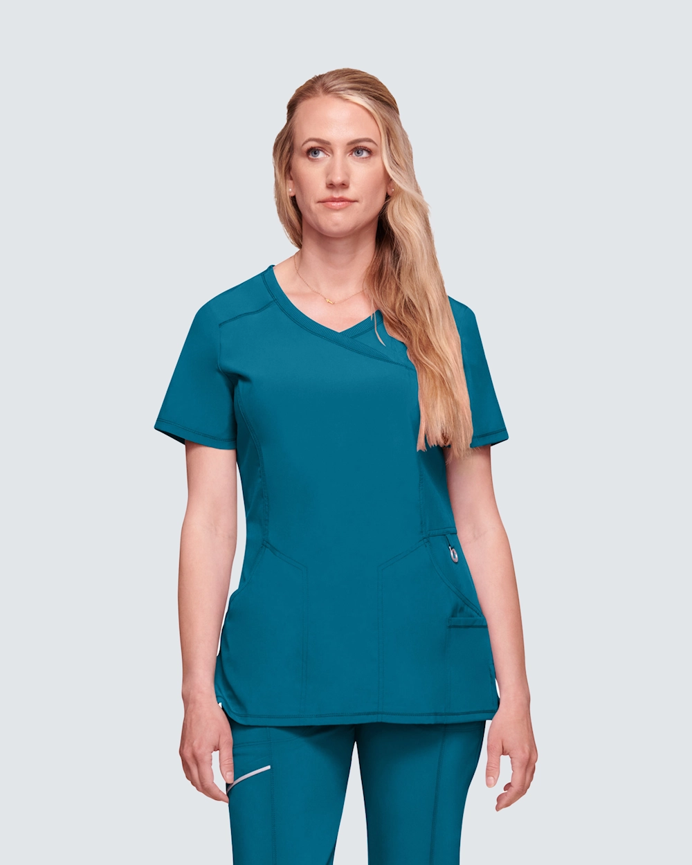 Den moderna damtunikan i omlottmodell kombinerar stil och funktionalitet för det professionella vårdteamet.