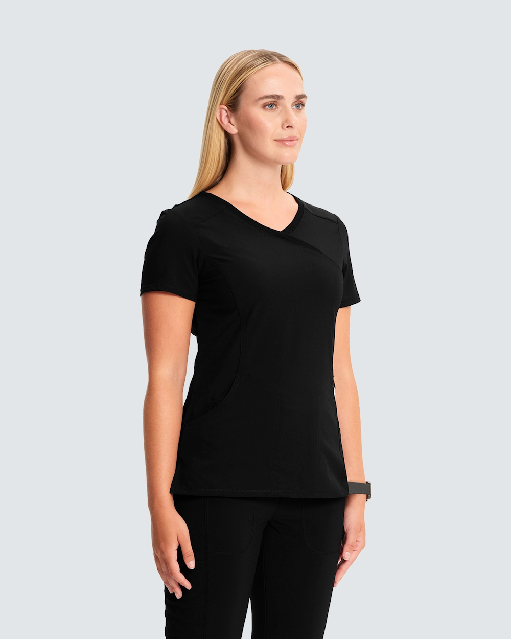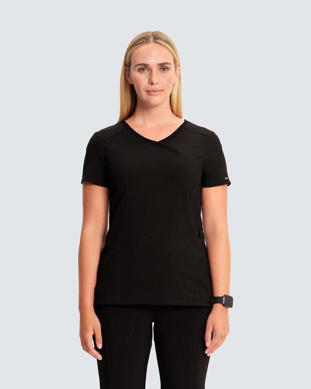 Den moderna damtunikan i omlottmodell kombinerar stil och funktionalitet för det professionella vårdteamet.