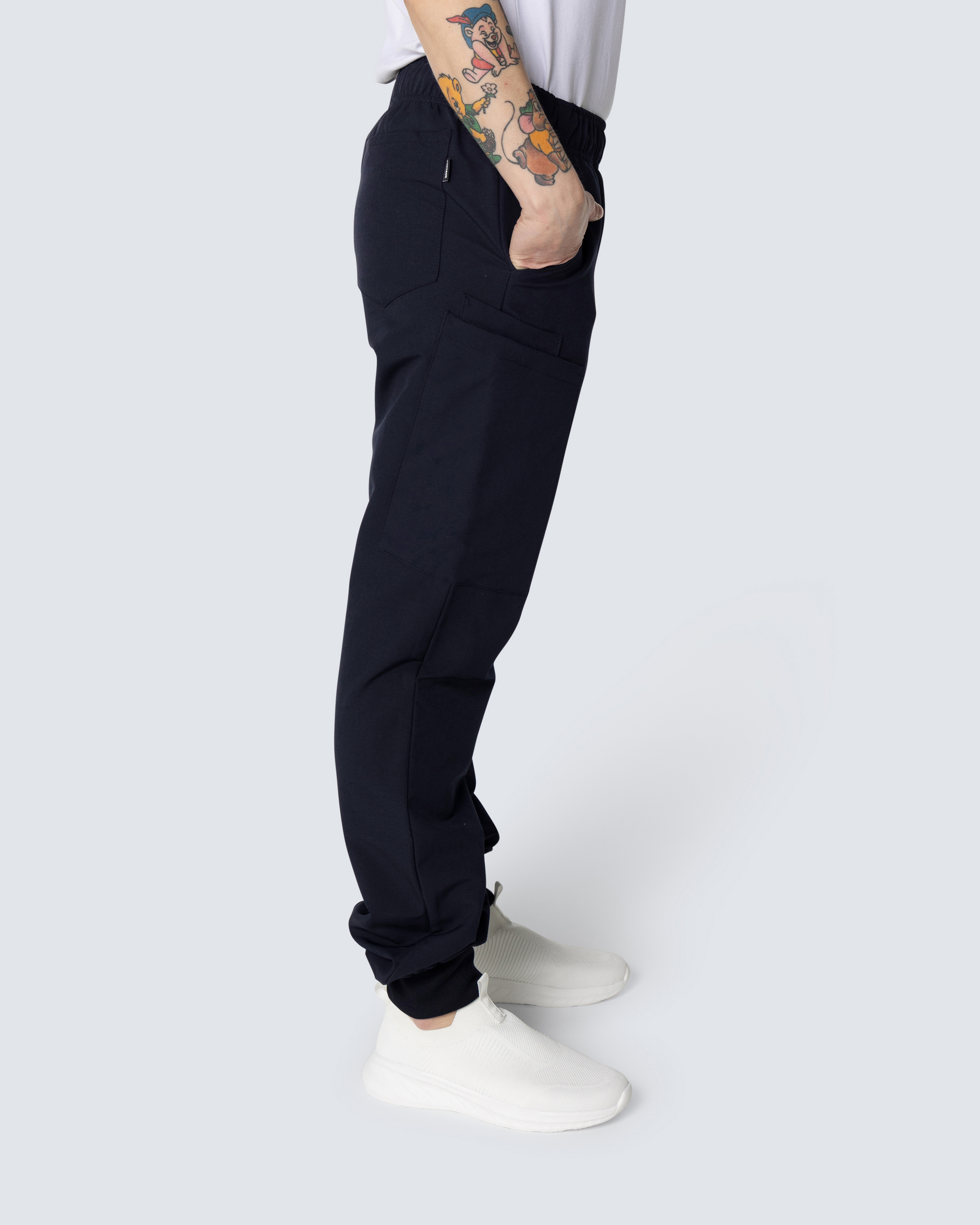 Bekväm muddbyxa i unisexmodell med mekanisk fyrvägsstretch. Tillverkad i återvunnen polyester från PET-flaskor. Resår och snörning i midjan och ribbad mudd i benslut. En bakficka och två rymliga lårfickor, varav en har mobilficka och dold tryckknappsstängning.