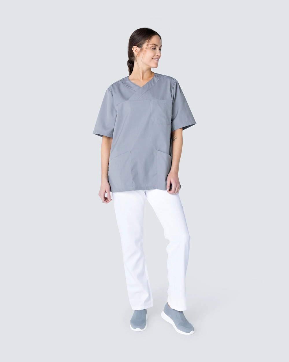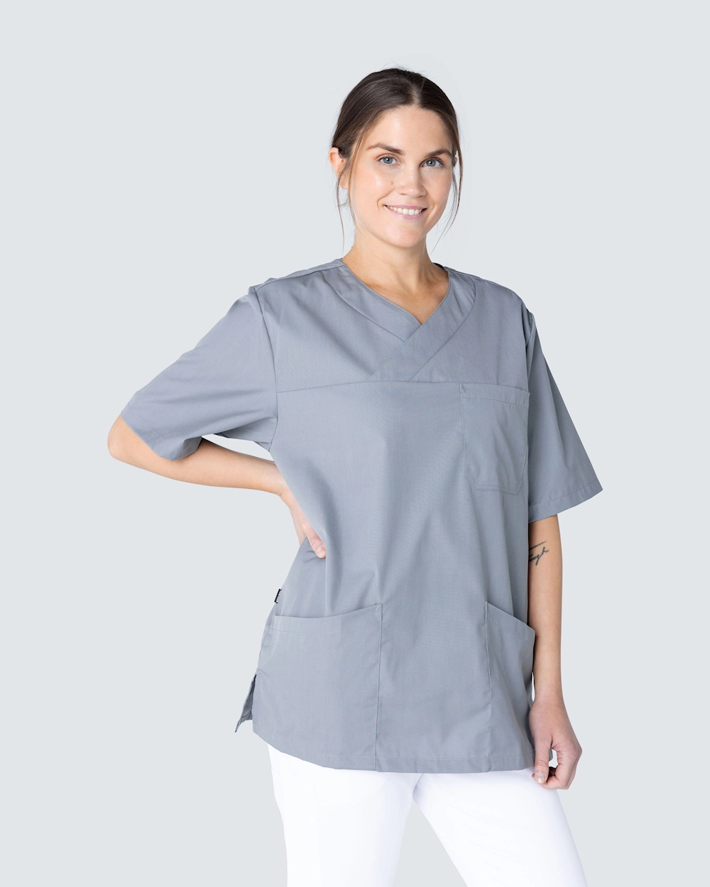 Skön och rymlig bussarong i polyester/bomullsblandning. Med praktiska och rymliga fickor får du enkelt plats med det du behöver ha med dig under ett arbetspass. De två fickorna framtill är snedskurna vilket ger en fin detalj på bussarongen.