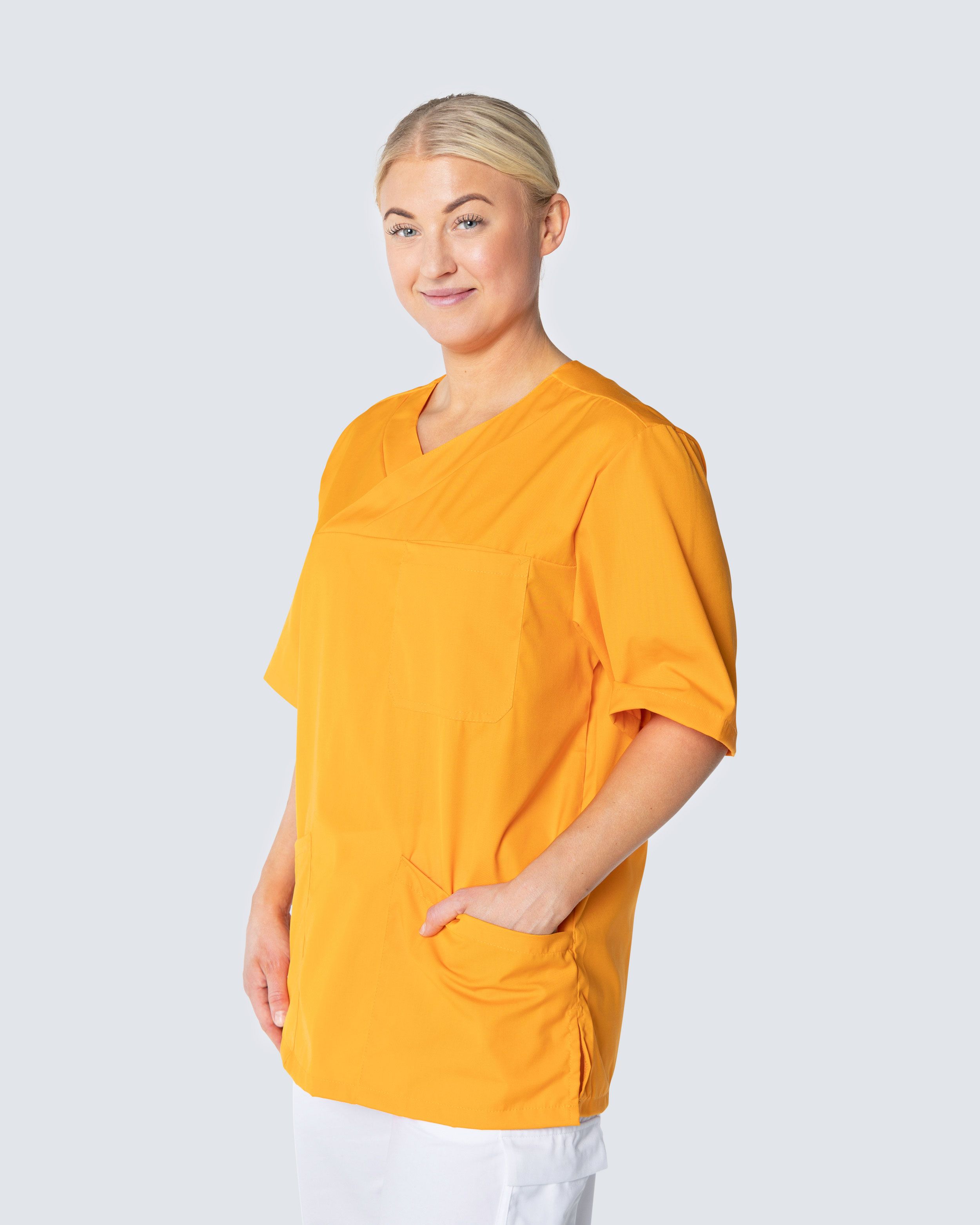 Skön och rymlig bussarong i polyester/bomullsblandning. Med praktiska och rymliga fickor får du enkelt plats med det du behöver ha med dig under ett arbetspass. De två fickorna framtill är snedskurna vilket ger en fin detalj på bussarongen.
