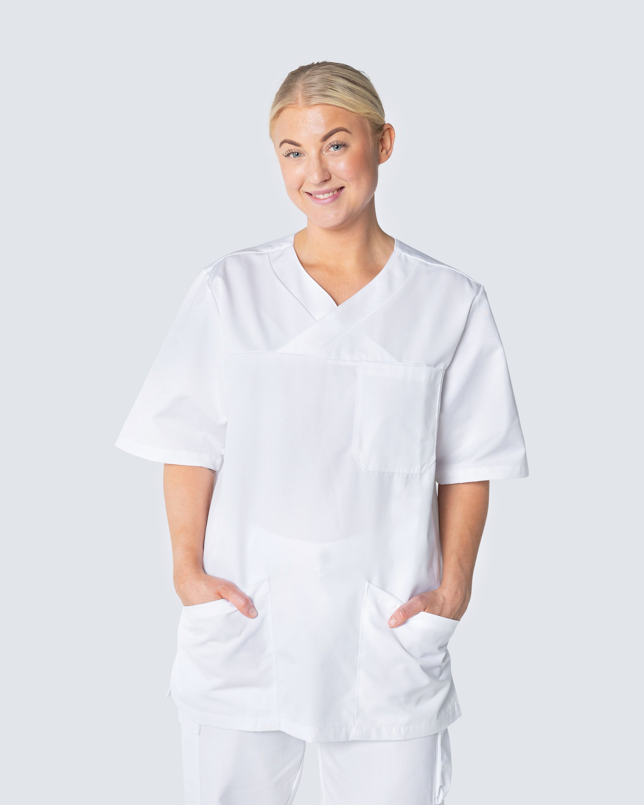 Skön och rymlig bussarong i polyester/bomullsblandning. Med praktiska och rymliga fickor får du enkelt plats med det du behöver ha med dig under ett arbetspass. De två fickorna framtill är snedskurna vilket ger en fin detalj på bussarongen.