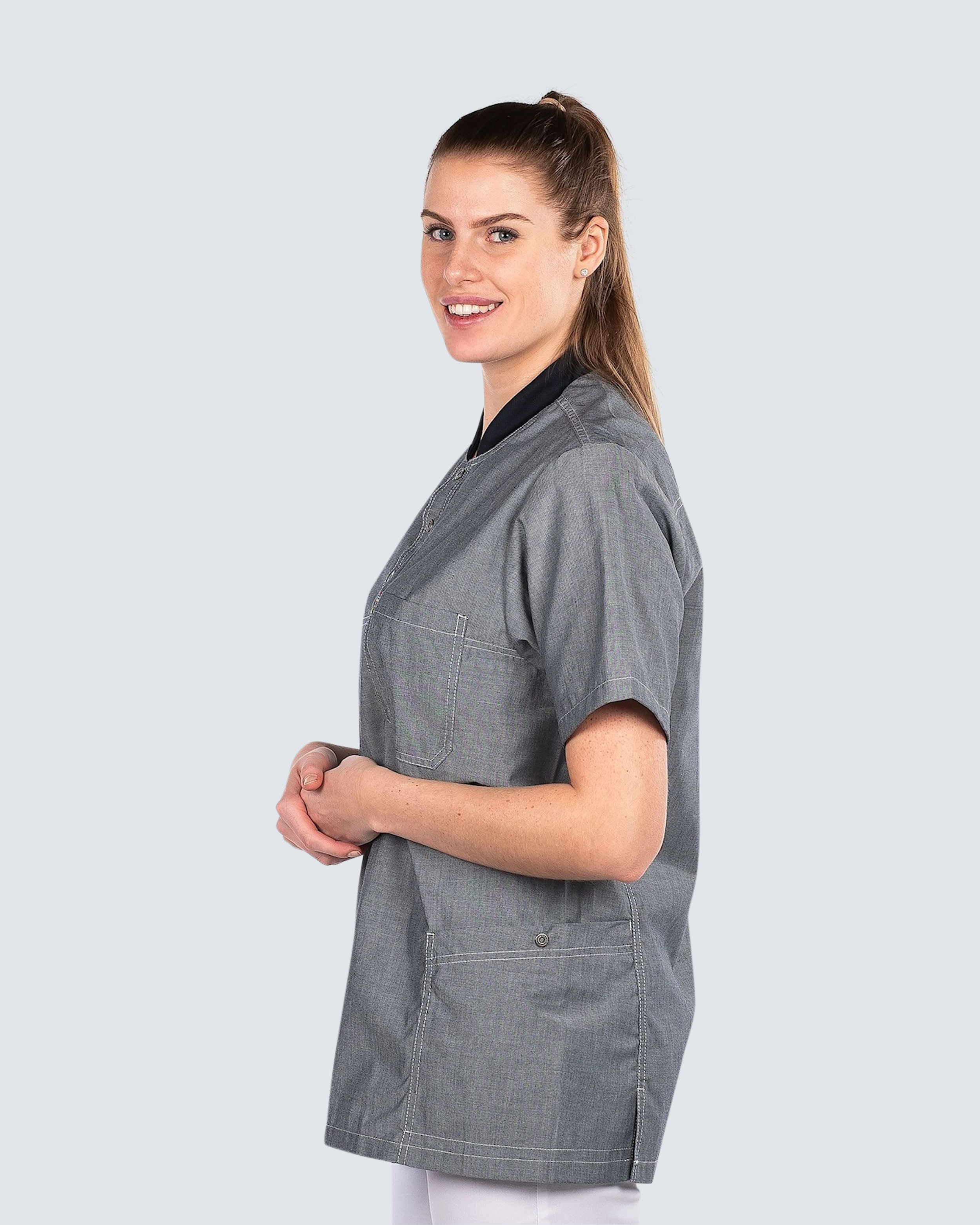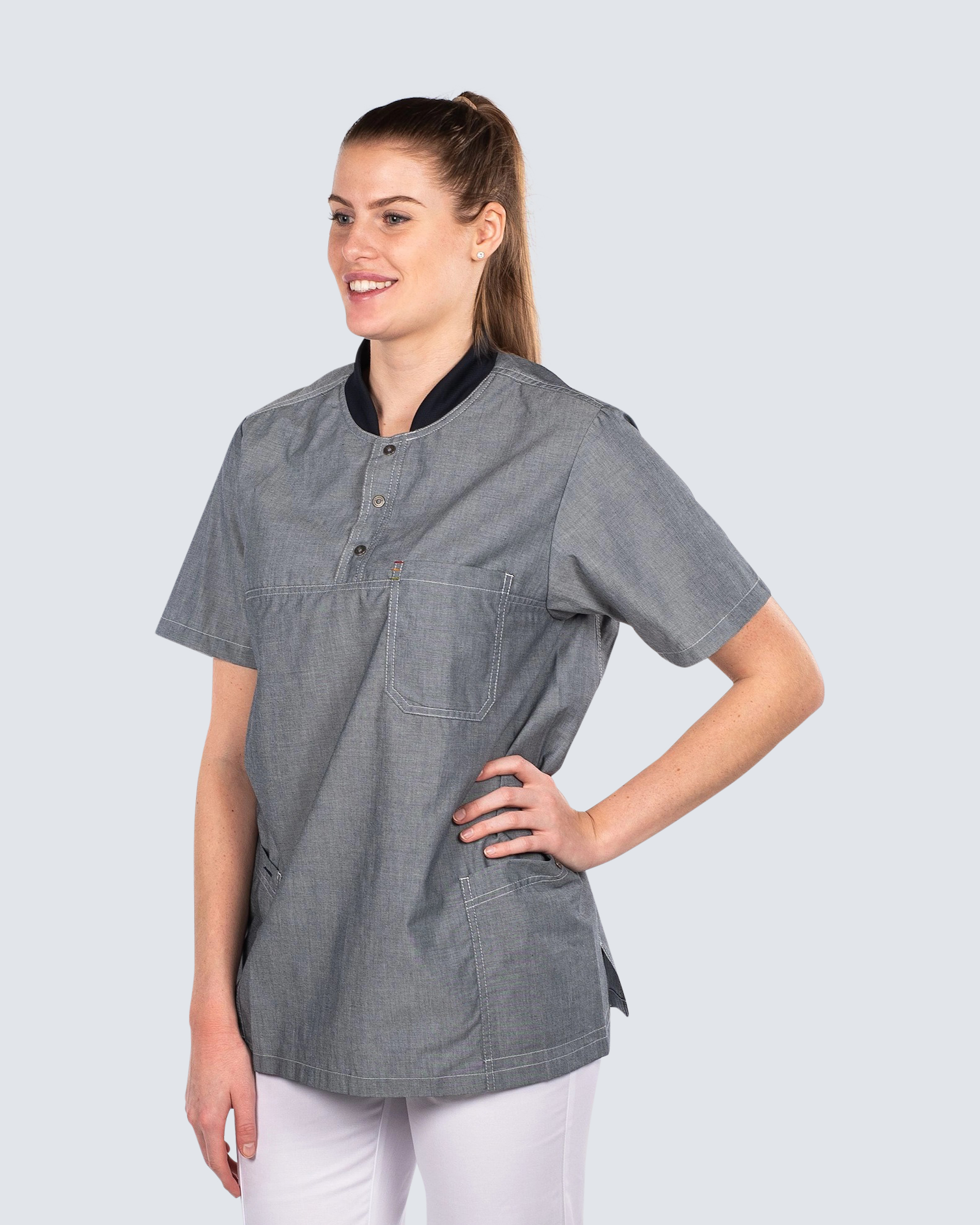 Bussarong i bomull/polyestertyg som har en lätt och behaglig känsla. Bussarongen har praktiska fickor, fina detaljer och en mjuk krage som sätter en fin ton på plagget.