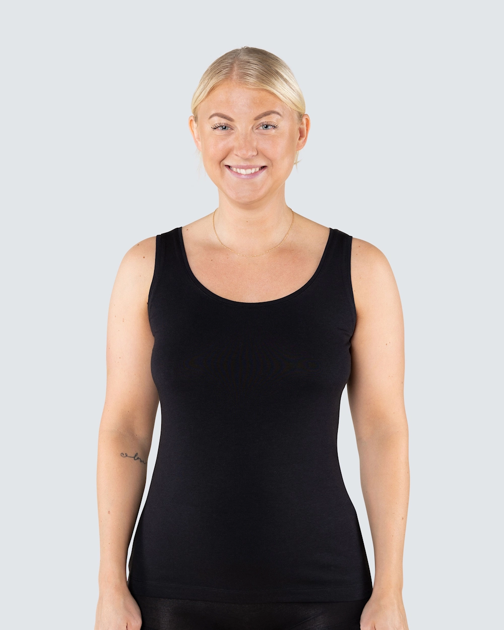 Mjukt och följsamt linne med figurnära passform och breda axelband som sitter bekvämt på axlarna utan att skava. Dekorativ, rund halsringning. Tack vare bambuns runda och lena fibrer sitter linnet skönt även på känslig hud. Bambu har även fukt- och temperaturreglerande egenskaper som gör materialet väl lämpat för underkläder och basplagg.
