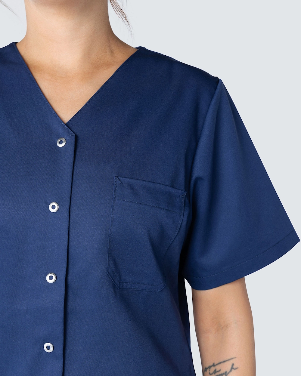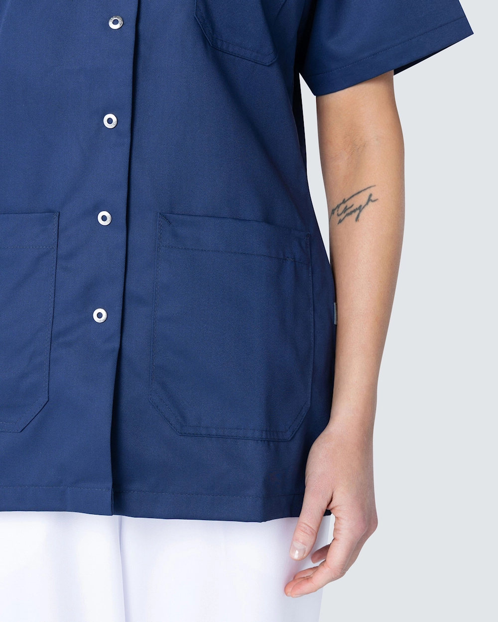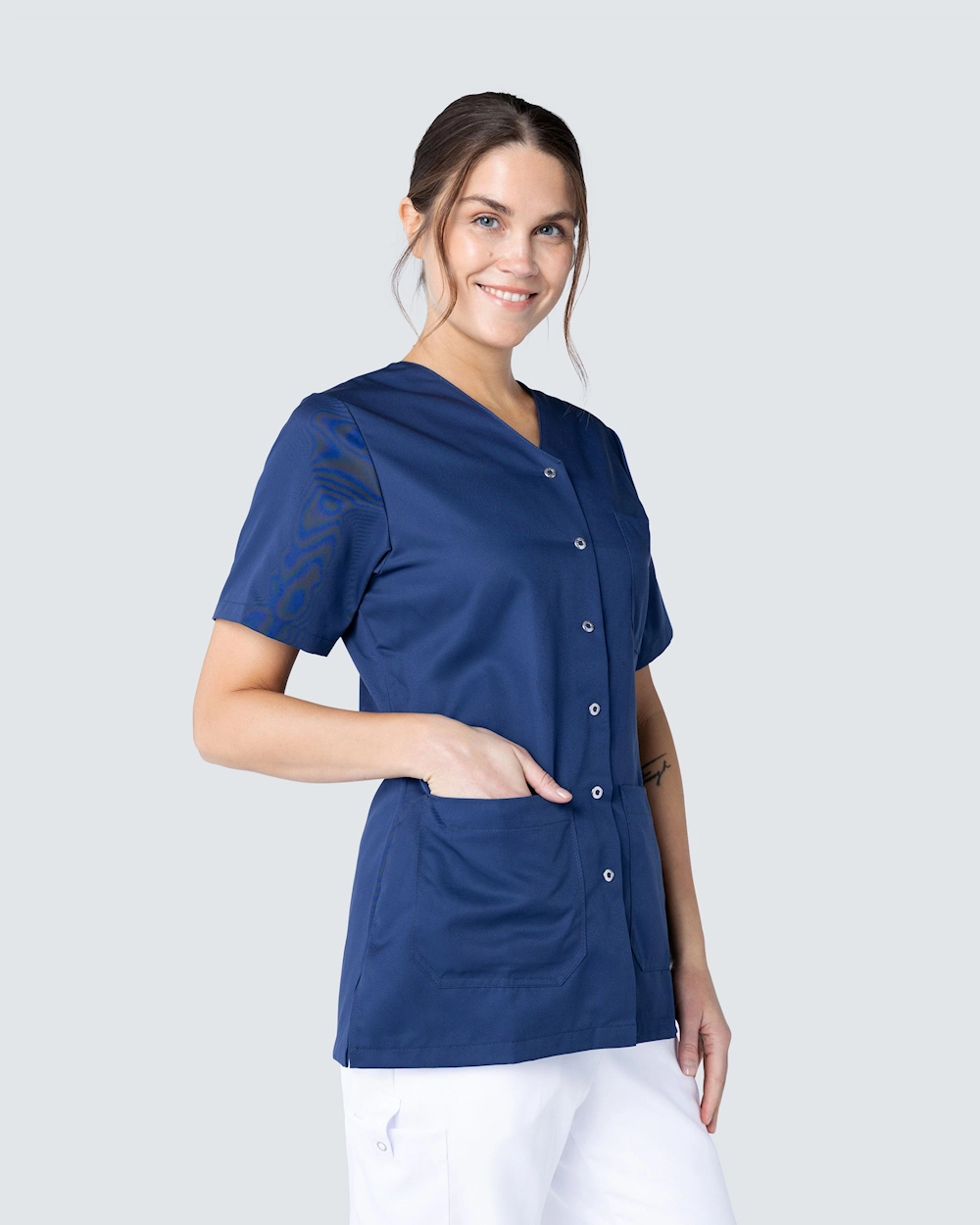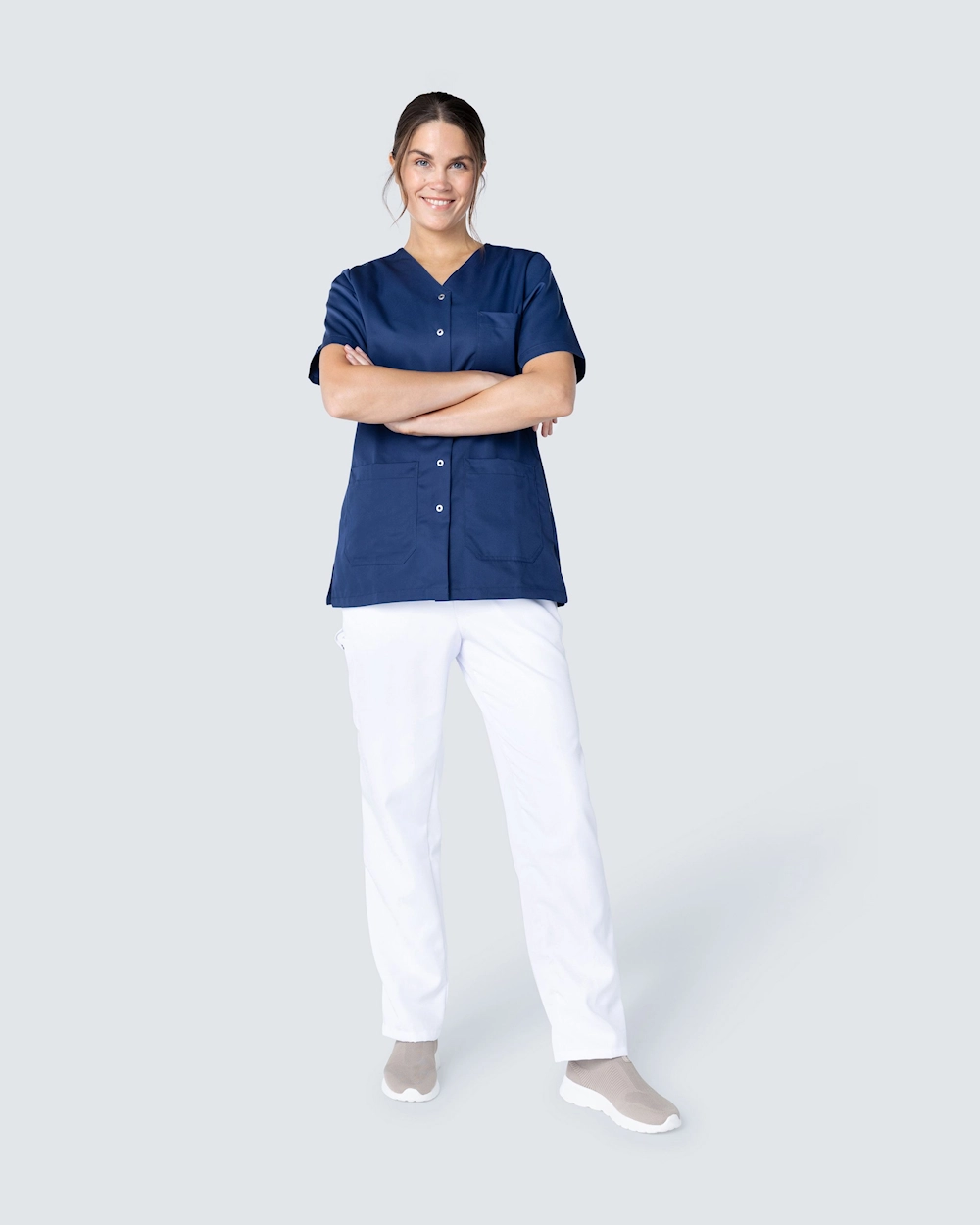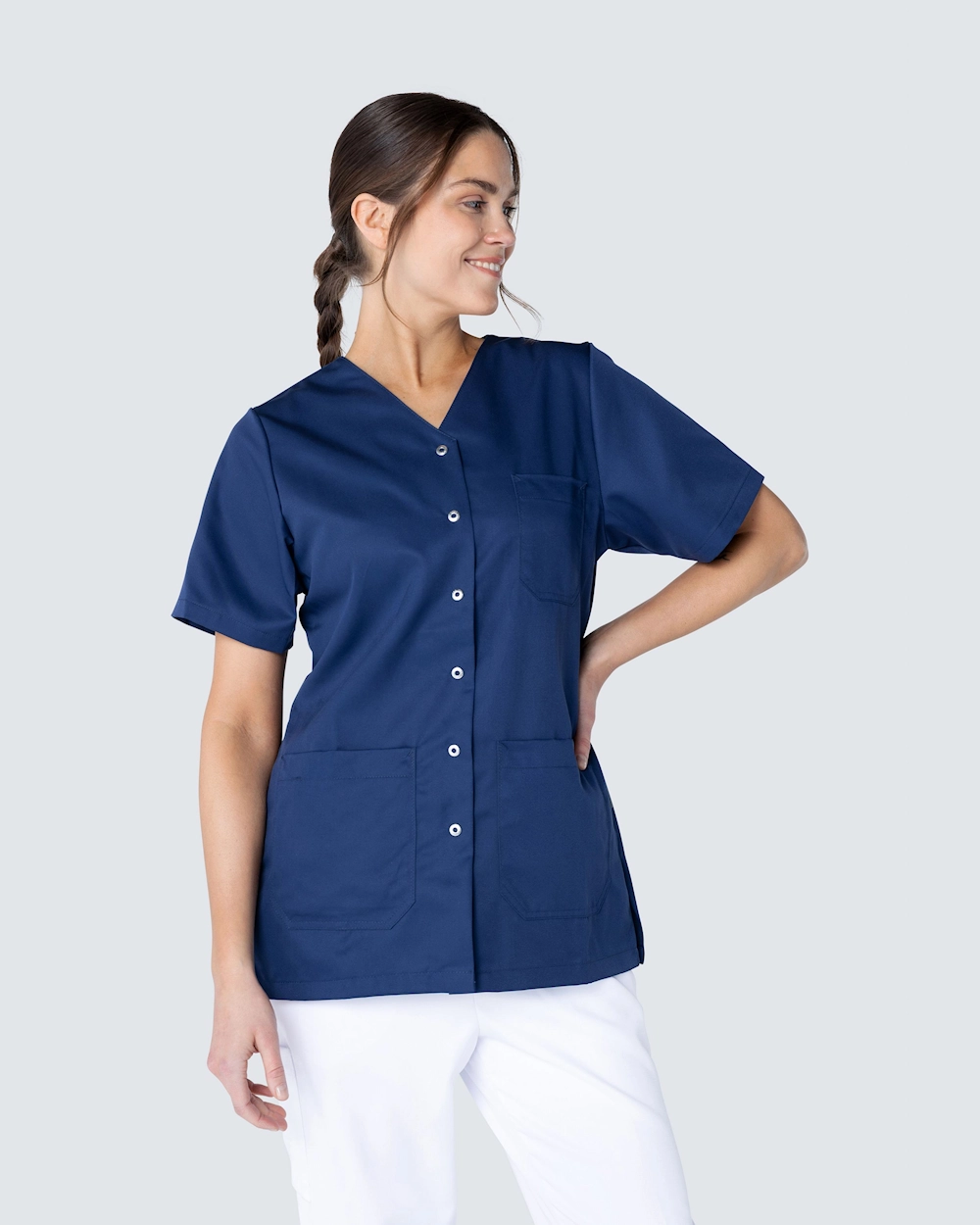 Vårdtunika i dammodell med lätt figursydd form för fin passform. Praktisk knappslå med tryckknappar - perfekt för dig med ett vårdyrke där det förekommer mycket smuts och spill och du inte vill dra tunikan över huvudet. Tunikan är tillverkad i miljövänliga Tencel som ger en skön komfort och god andningsförmåga.