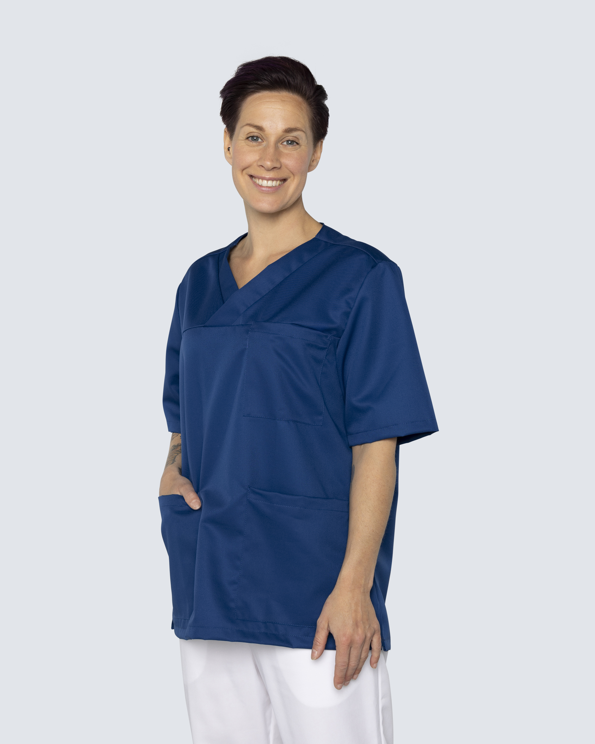 Bussarong i unisexmodell med avslappnad, rymlig passform och sportigt utseende. Plagget har en generös längd och slitsar i sidorna för optimal rörelsefrihet. Bröstficka och två rymliga höftfickor, varav en har mindre innerficka för exempelvis mobiltelefon eller mindre hjälpmedel. Bussarongen har hög andningsförmåga och är tillverkad i slitstark och temperaturreglerande Tencel, ett material som sitter behagligt mot kroppen.
