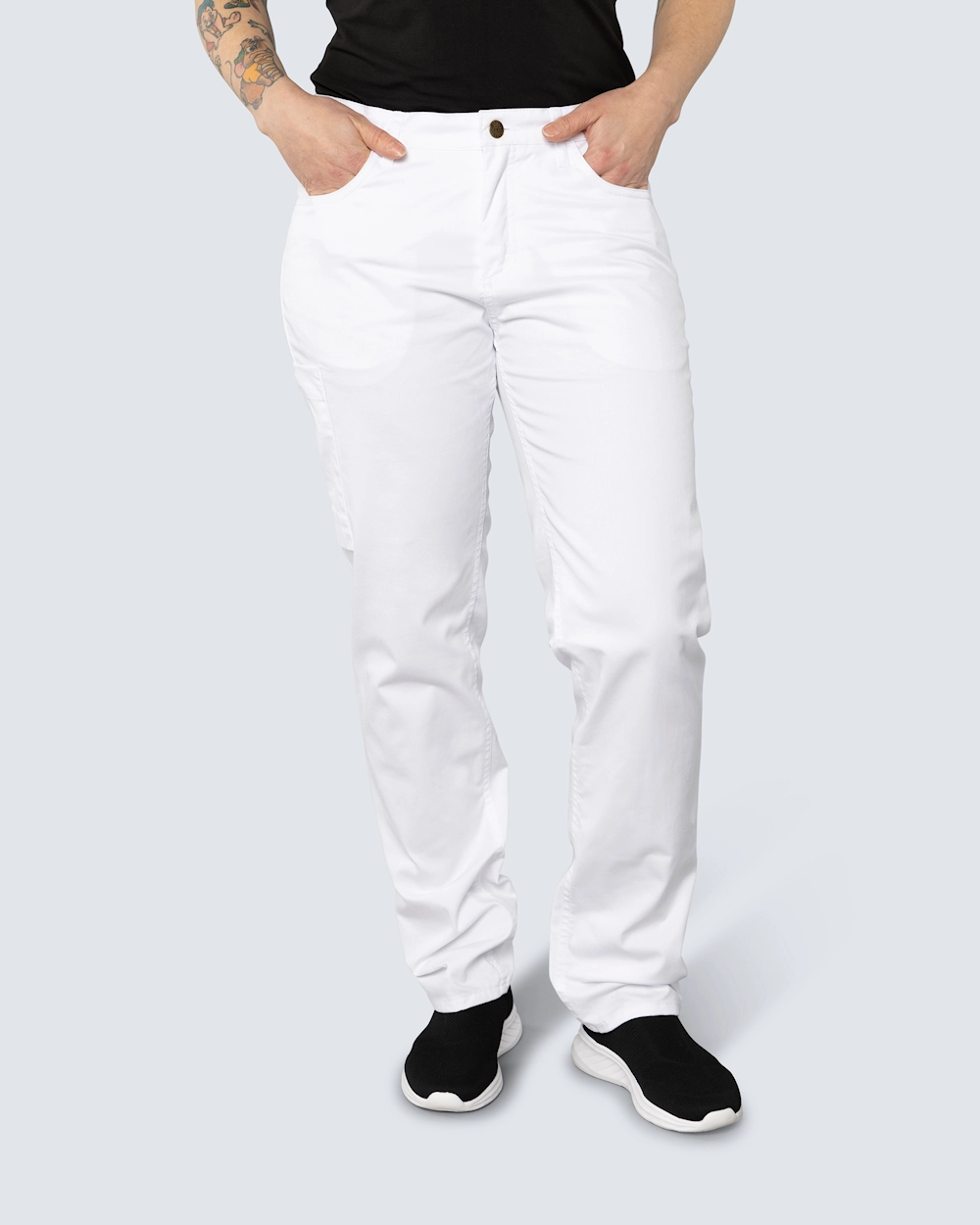 Nybo Jeans Unisex Supercool kombinerar stil och funktion för vårdpersonal som söker stilrena och bekväma jeans. Dessa stretchiga jeans anpassar sig till alla kroppstyper och erbjuder en ungdomlig passform med justerbar midjeresår för optimal komfort. En diskret lårficka med tryckknappsstängning ger extra förvaringsutrymme. Byxorna är tillverkade i ett stretchigt men kraftigt material för att förhindra att de blir genomskinliga. Modellen finns i tre längder och detta är varianten med standardlängd.