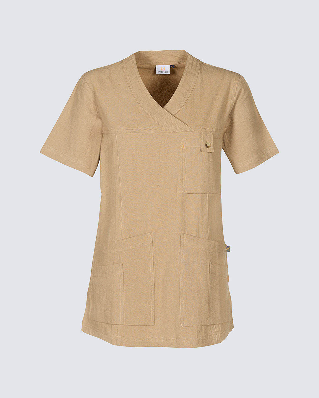 Med en smickrande V-ringning och korta ärmar erbjuder den komfort under hela skiftet.