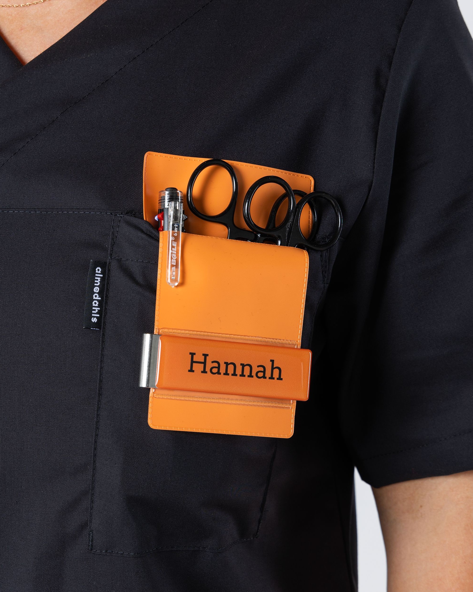 En färgglad pennficka i plast som ser till att dina pennor inte försvinner samtidigt som du skyddar dina plagg mot bläckläckage. Ett snyggt sätt att alltid ha en penna nära till hands. På framsidan av pennfickan finns en ficka för namnskylt.