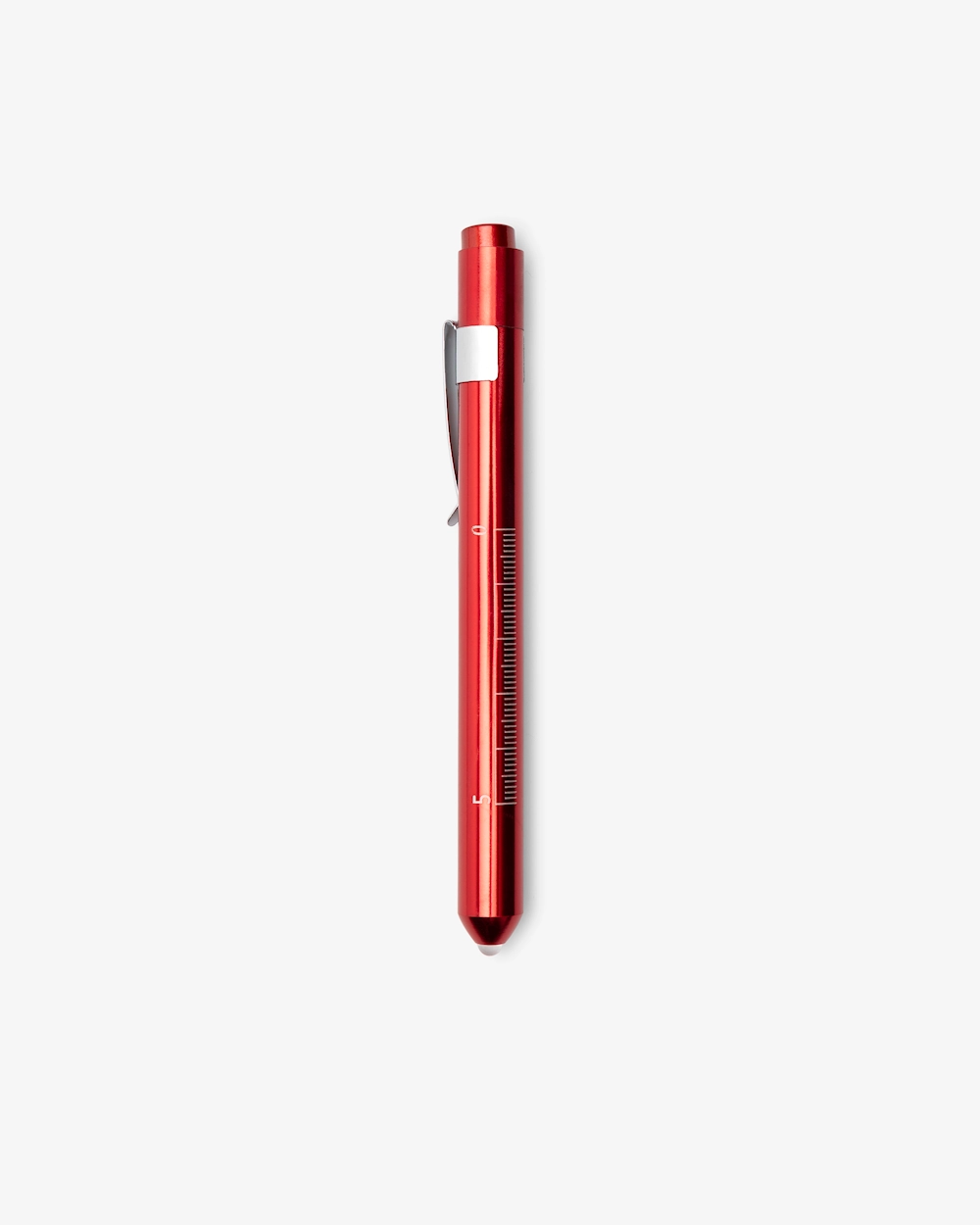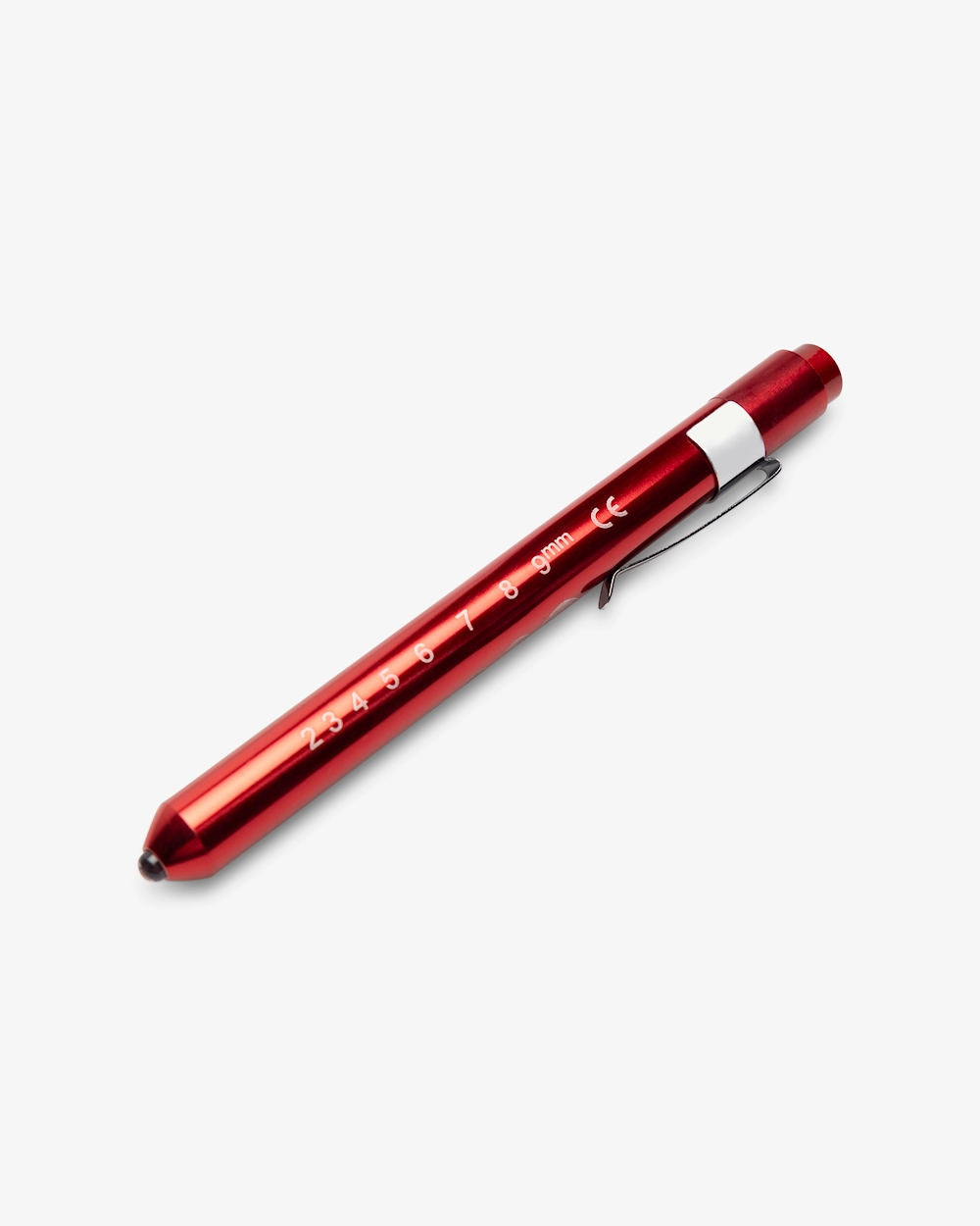 Praktisk pennlampa för ögonundersökningar, med pupillmätare (2-9 mm) och avståndsmätare (0-50 mm). Lampan är 13 cm lång och 1,2 cm i diameter, utrustad med en LED-lampa. Batteri: 2 x AAA (ingår ej).