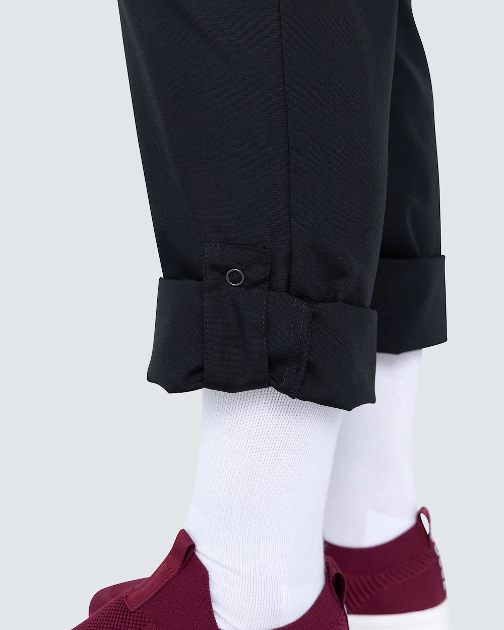Den här byxan från Segers har tryckknappar och tampar för reglering av benlängd.