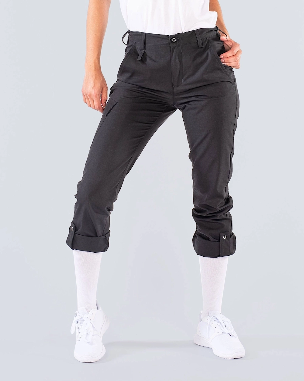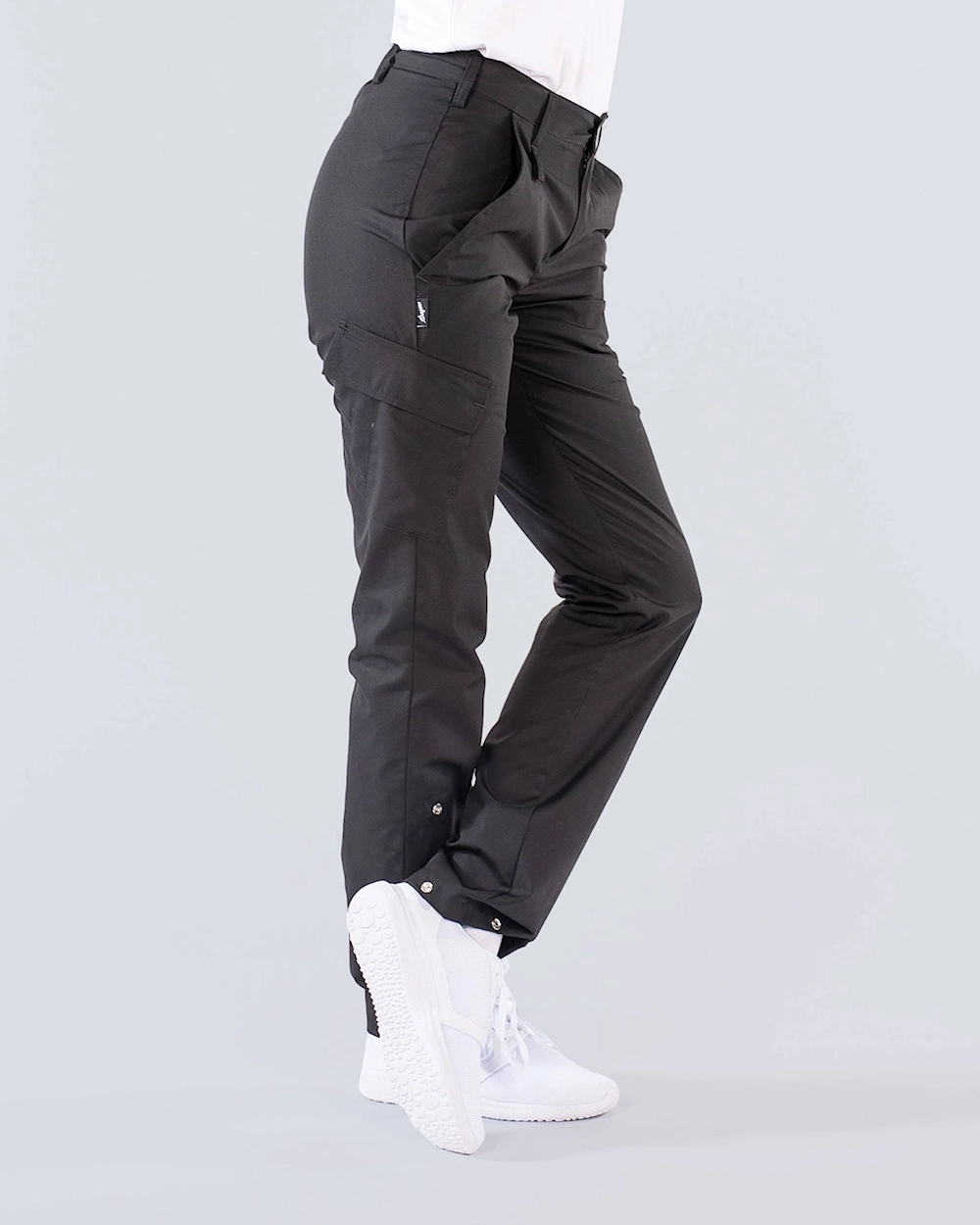 Den här byxan från Segers har tryckknappar och tampar för reglering av benlängd.