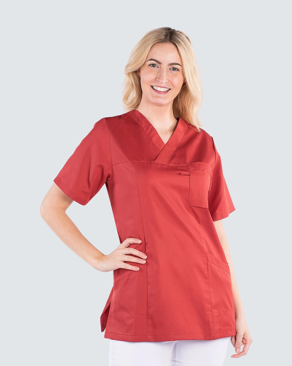 Denna arbetstunika är tillverkad i miljövänlig Tencel som ger en lätt och skön känsla på kroppen och andas bra - perfekt för dig som vårdpersonal med långa och varma arbetspass. Tunikan har två sidfickor med nyckelhälla och telefonficka samt bröstficka. Med v-ringad hals och lätt figursydd får plagget en fin passform.