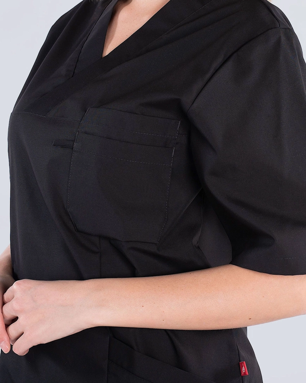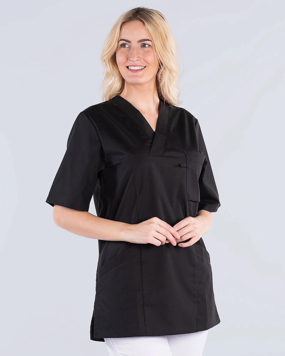 Denna sköna vårdtunika är tillverkad i miljövänlig Tencel som ger en lätt och skön känsla på kroppen, andas bra och ger samtidigt en hög komfort. Tunikan har två snedställda framfickor med nyckehälla och telefonficka samt en bröstficka för förvaring av pennor och block. Sprund i sidan ger god rörelsevidd.