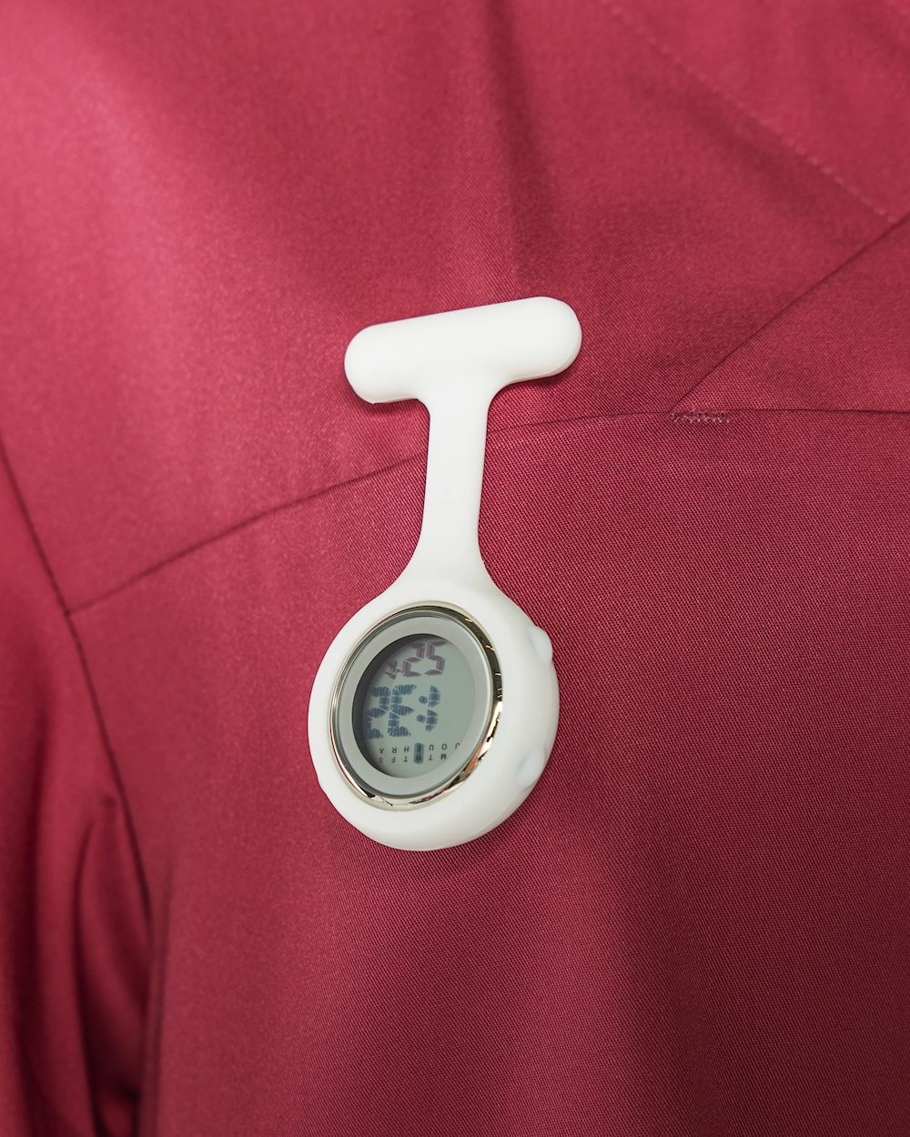 Sjuksköterskeklocka med silikonskal som du enkelt kan plocka av för att rengöra eller för att byta färg på skalet. Klockan har digital tidsvisning och smidiga funktioner som datum, veckodagsvisning, 12/24 timmars visning, alarm och stoppur. Klockan fäster du enkelt i din arbetsbussarong med hjälp av säkerhetsnålen på baksidan. Manual för klockan hittar du här.