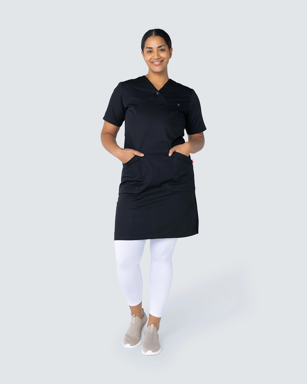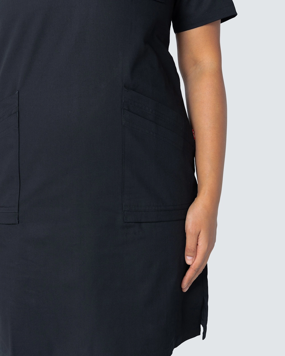 Lätt insvängd arbetsklänning med dekorativ V-ringning. Knälång modell med två dubbla snedställda sidfickor som ger plats åt diverse arbetsredskap och hjälpmedel. Klänningen har även en bröstficka med knapp och praktisk nyckelhälla, och sprund i sidan ger optimal rörelsefrihet genom arbetsdagens alla moment.