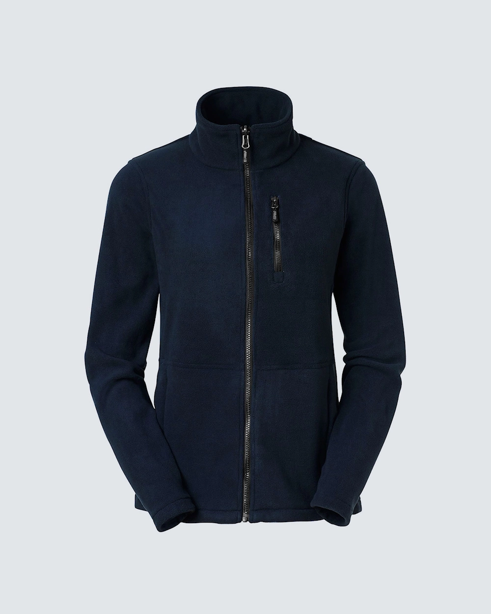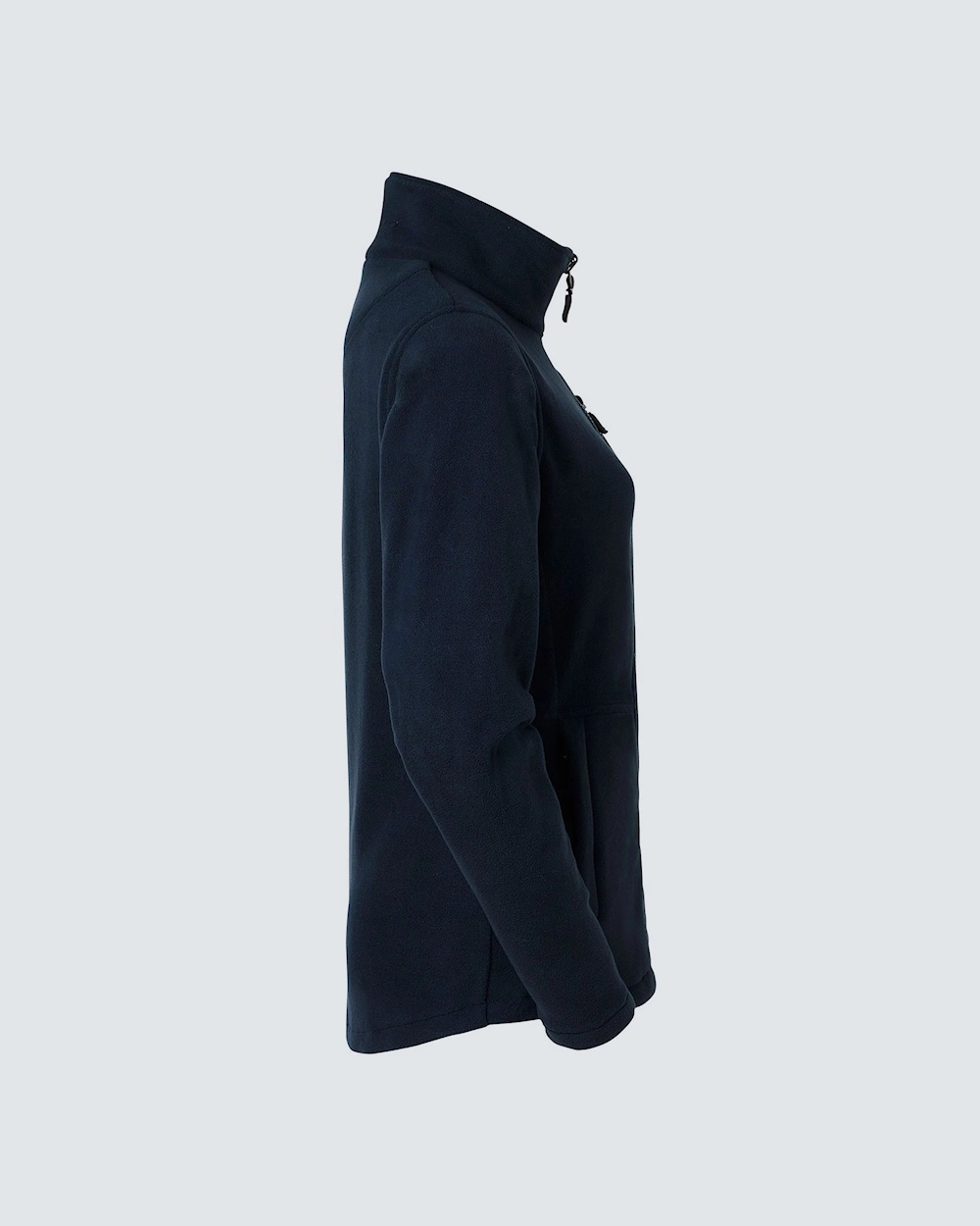 Fleecejacka med dampassform. Två sidfickor och en ficka på vänster bröst. Samtliga fickor har dragkedjor i kontrastfärg. Fleecen levereras med svarta zip-pullers som går att byta vid behov.