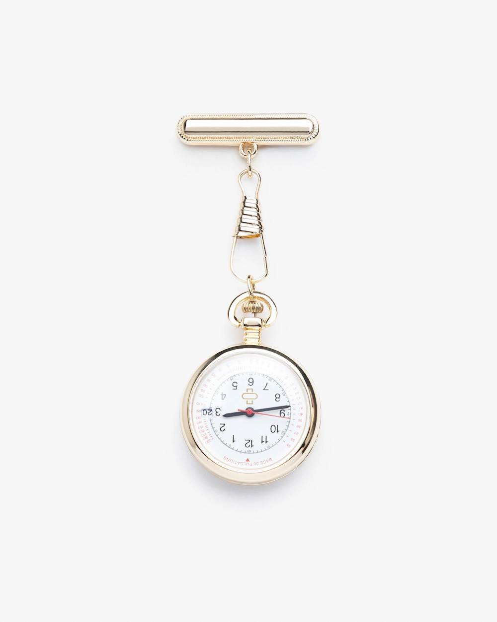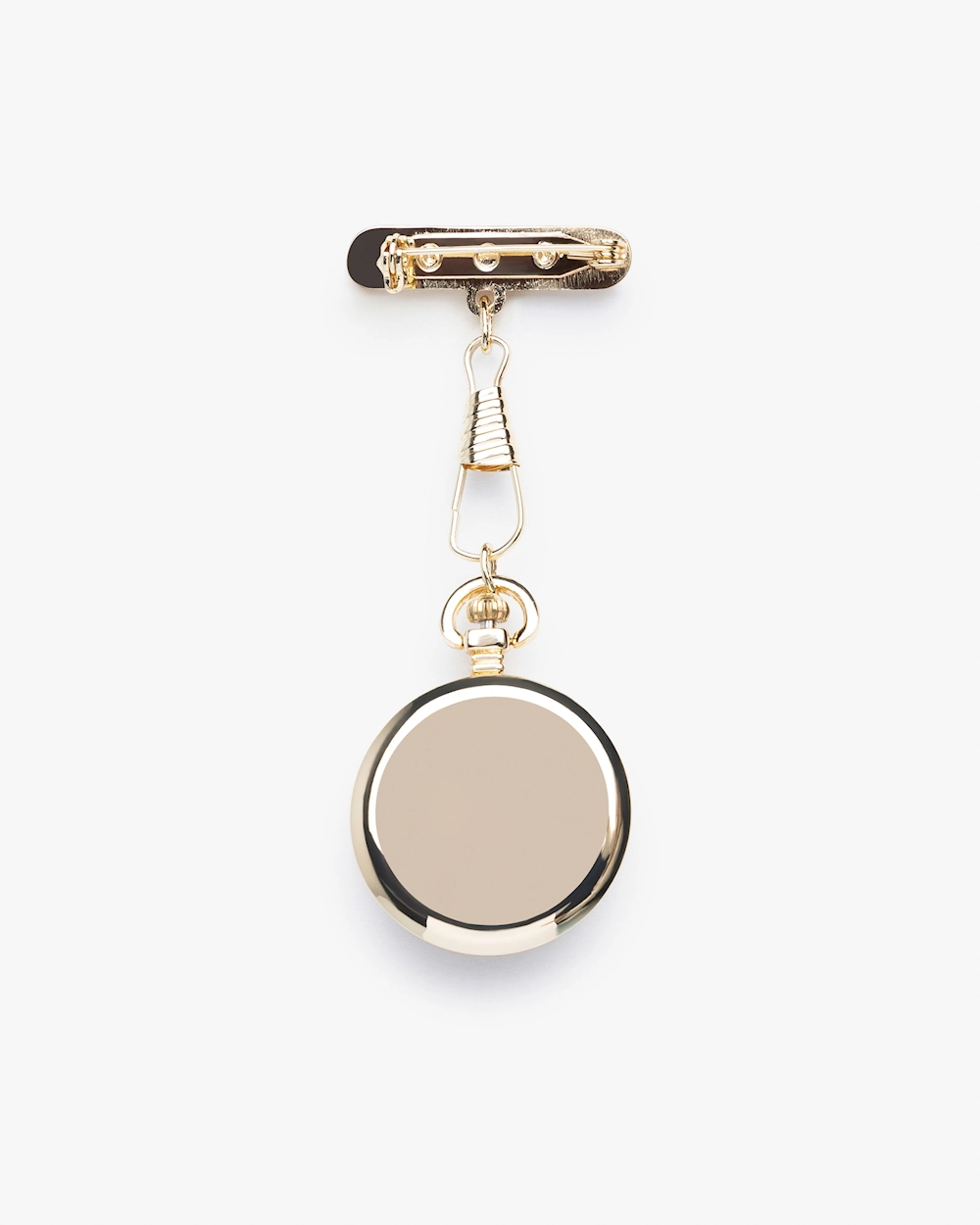 Gyllene tider, visar vårt systerur i guldfärg. Detta systerur är en elegant klocka med pulsfunktion och datumvisning. Klockan hänger fast i broschfästet med en liten karbinhake som gör att man på fritiden kan flytta över det fina uret till exempelvis en längre halskedja.