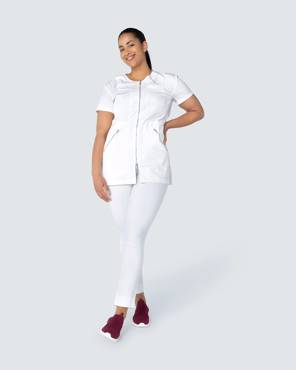 Figursydd topp från Wear at Work, som är tillverkad i ett slitstarkt och skönt stretchtyg. Rundhalsad modell med kort ärm. Sprund i sidorna och 2-vägsdragkedja framtill för full rörelsefrihet.